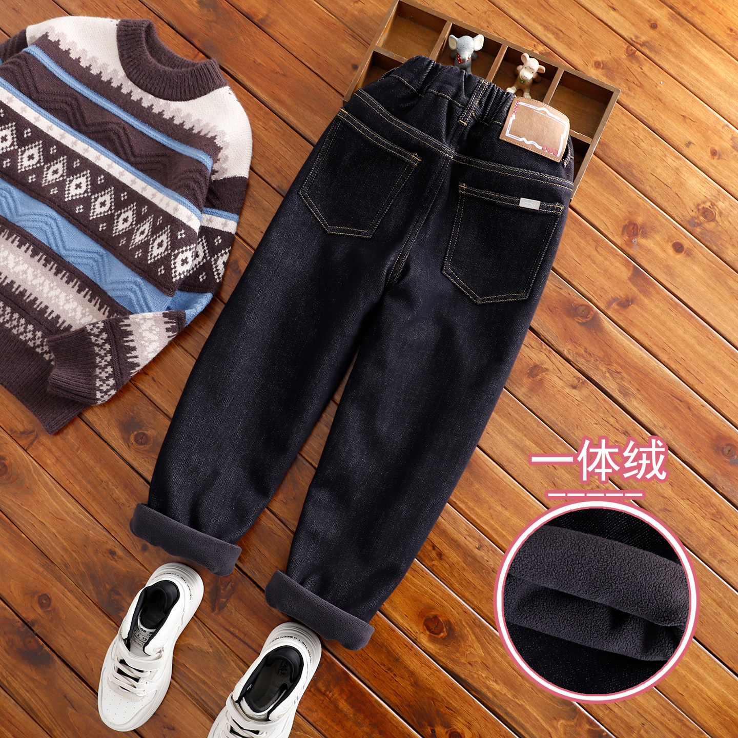 子冬装 儿童加绒加厚一体绒保暖长裤 2025秋冬新款 男童加绒牛仔裤