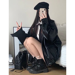 复古美式 美拉德 咖色皮衣夹克外套女早春秋甜酷风机车PU皮宽松长袖