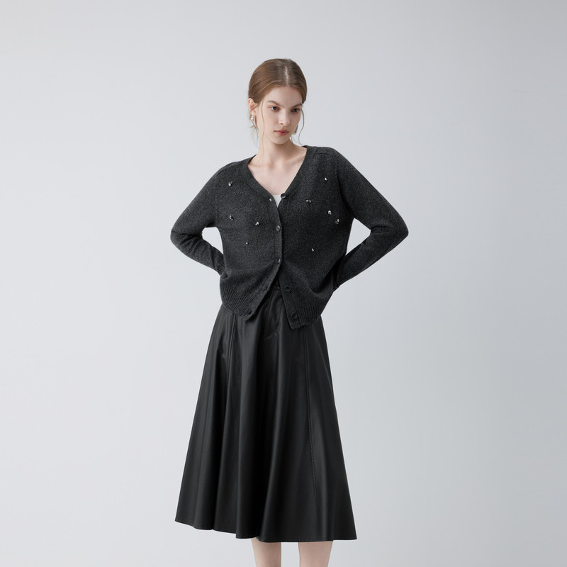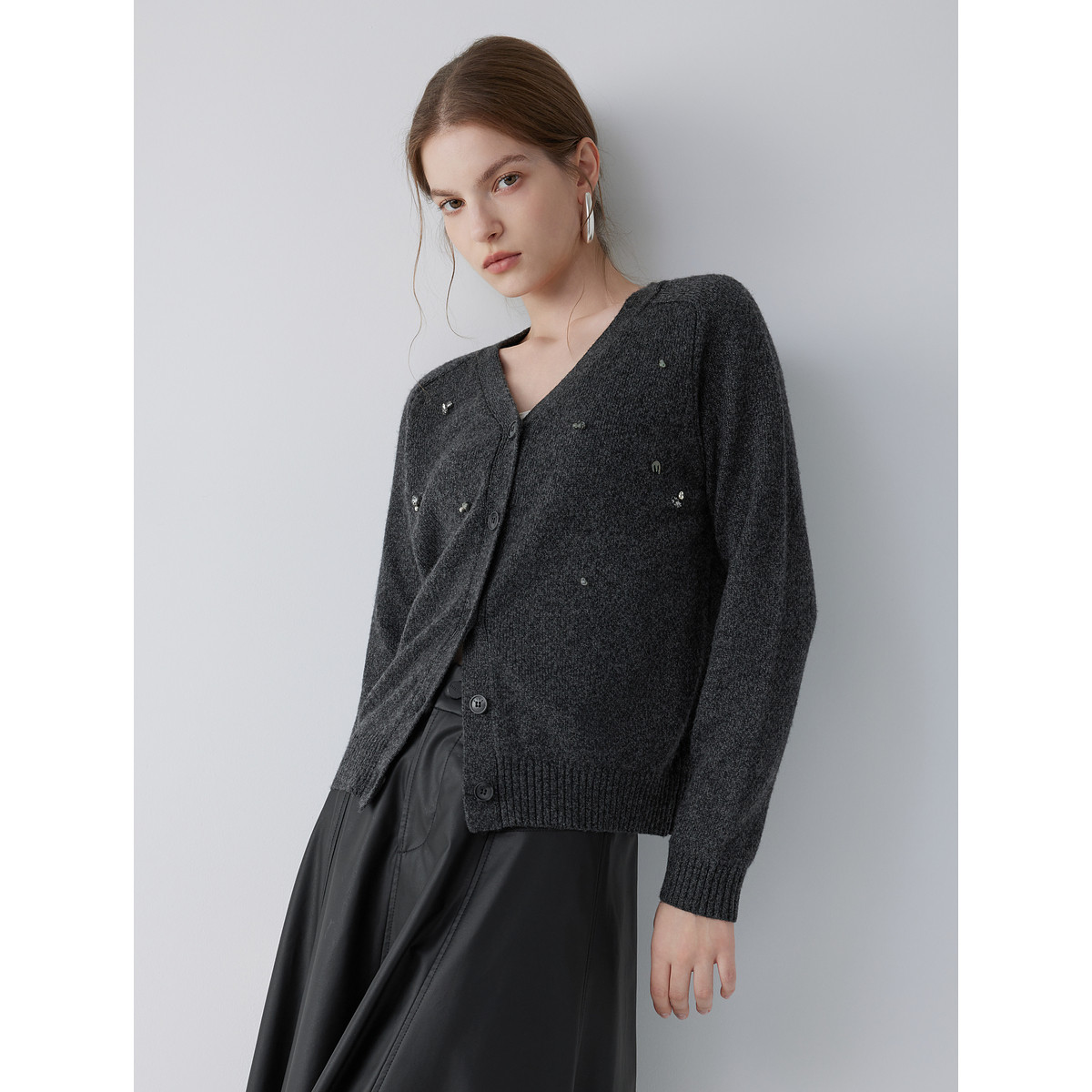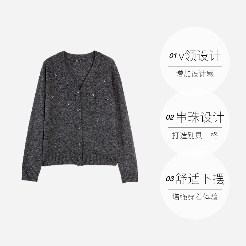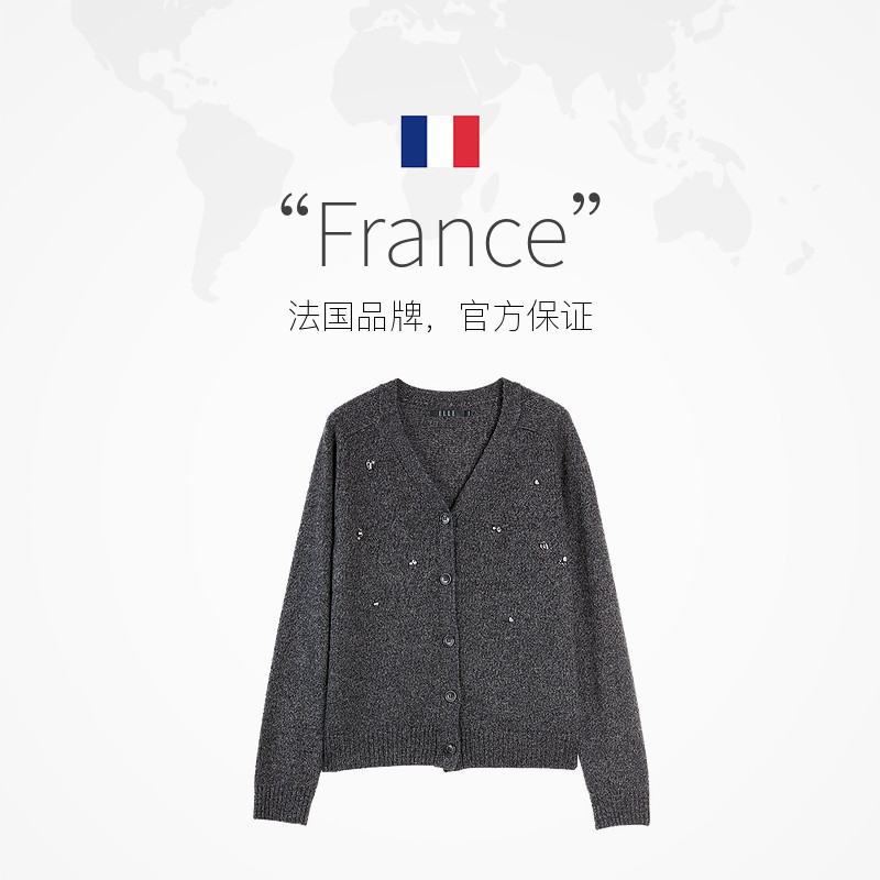 女2025秋新款 ELLE重工钉珠绵羊毛针织开衫 休闲设计感毛衣 自营