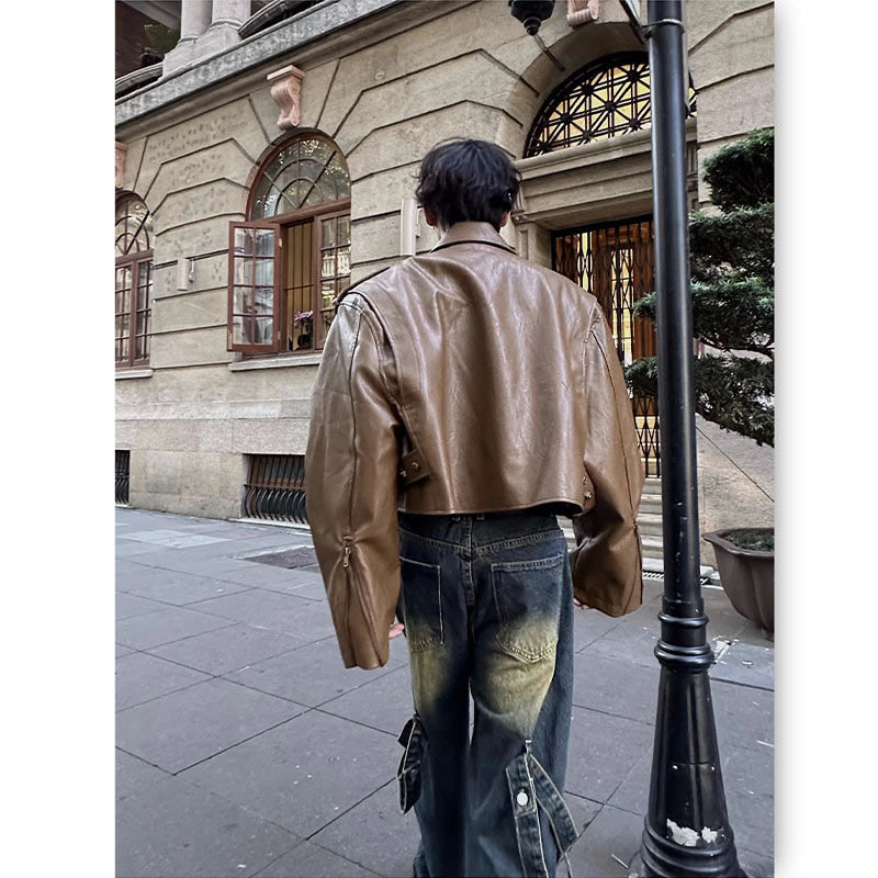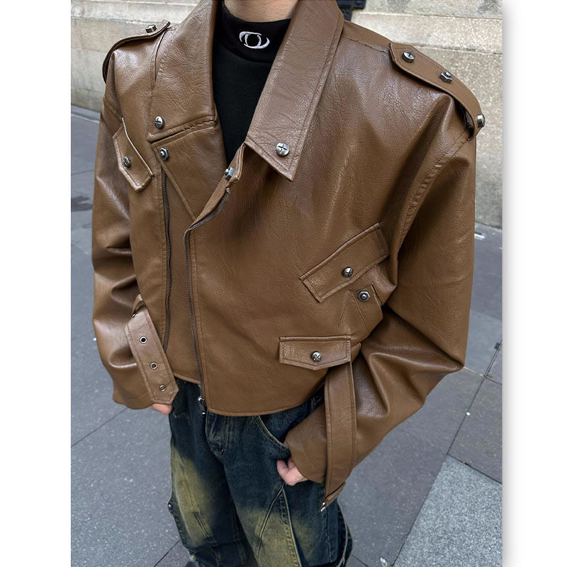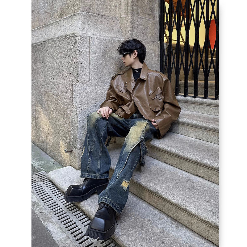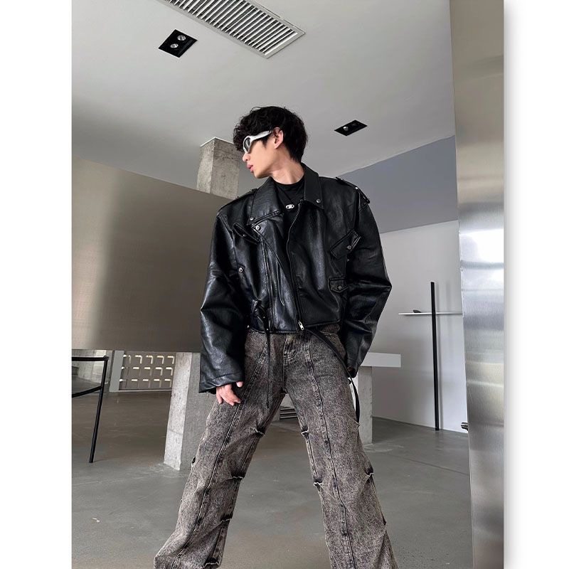 重工拼接设计牛仔裤 百搭美拉德铆钉多口袋斜门襟皮衣 两件装