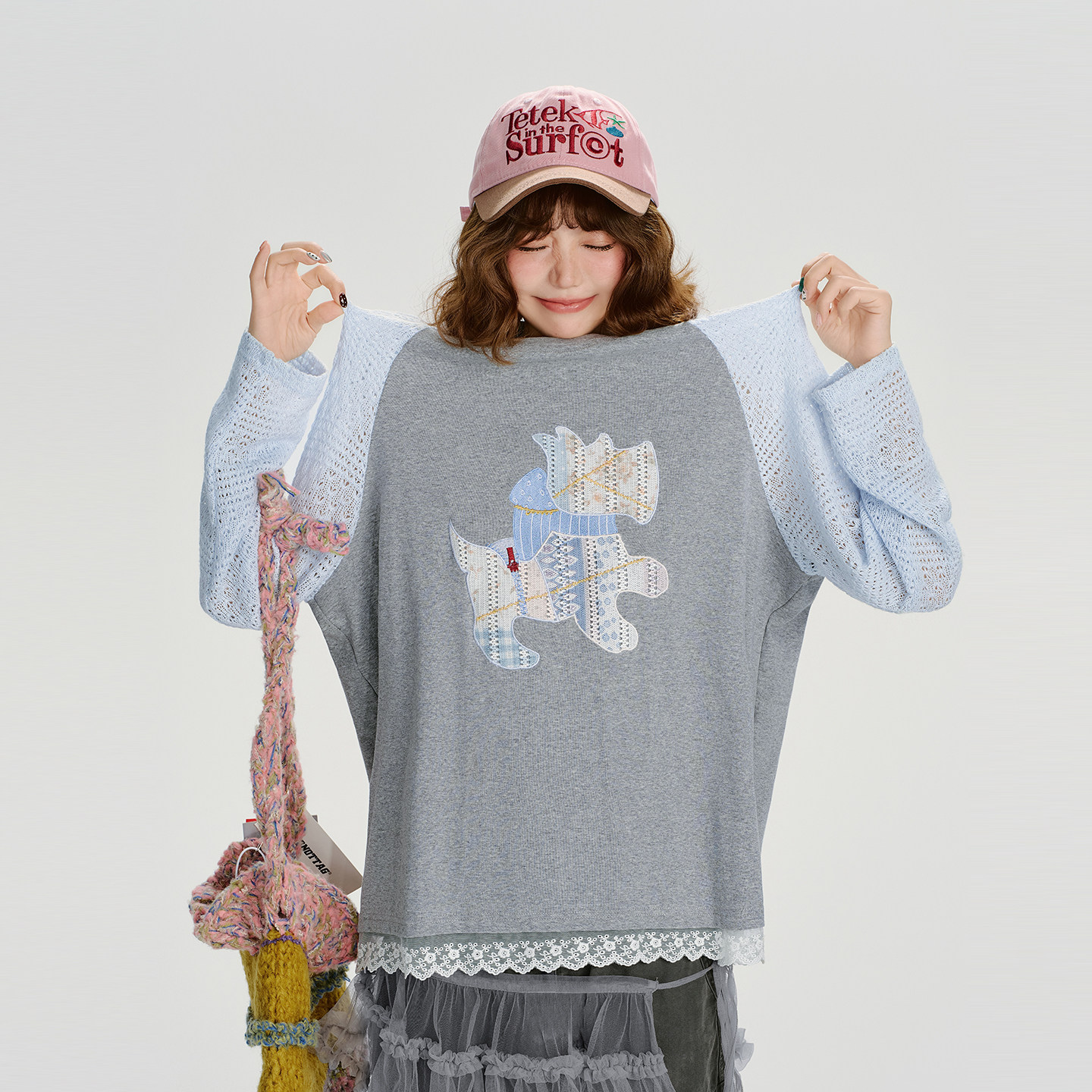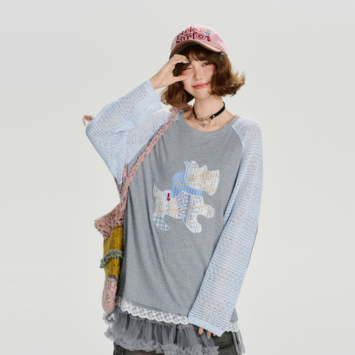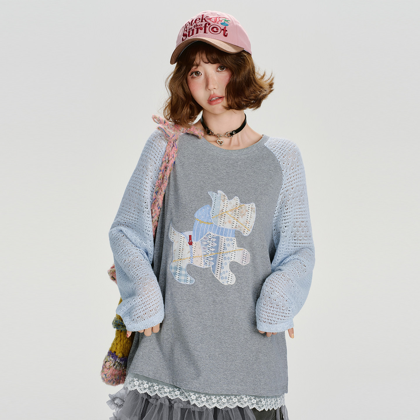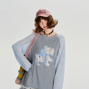新款 t恤女秋季 拼花边宽松上衣 复古贴布绣插肩长袖 Girlyhalo美式