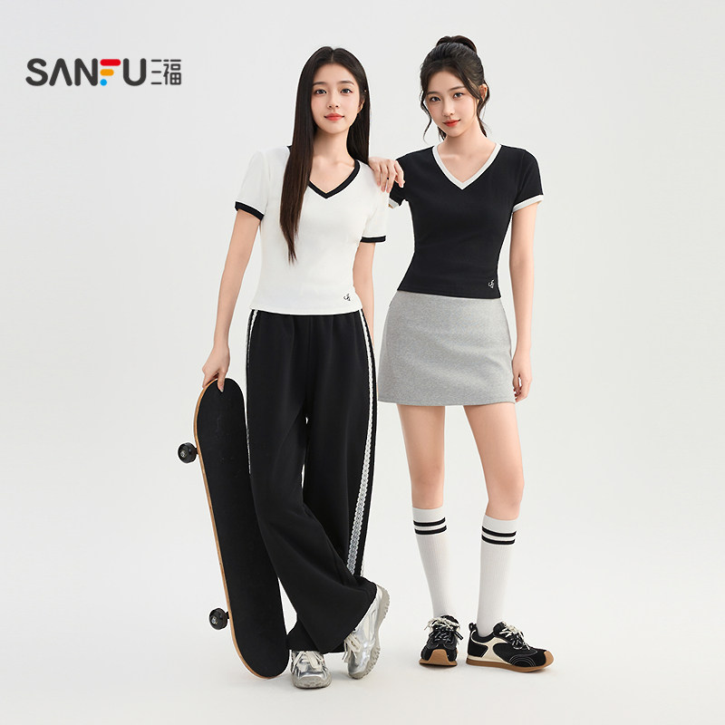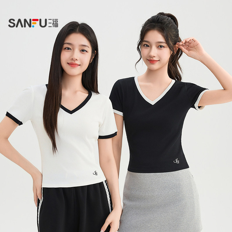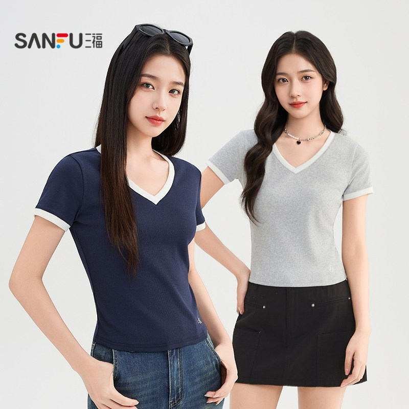 气质撞色V领时尚 夏季 修身 显瘦短款 三福短袖 上衣女装 T恤女2026新款