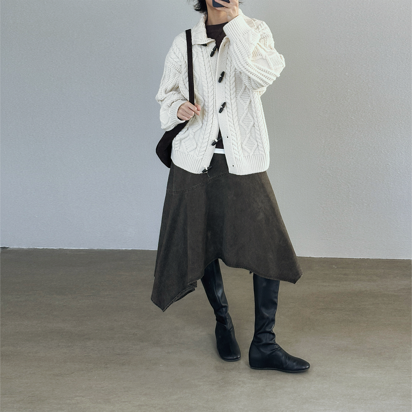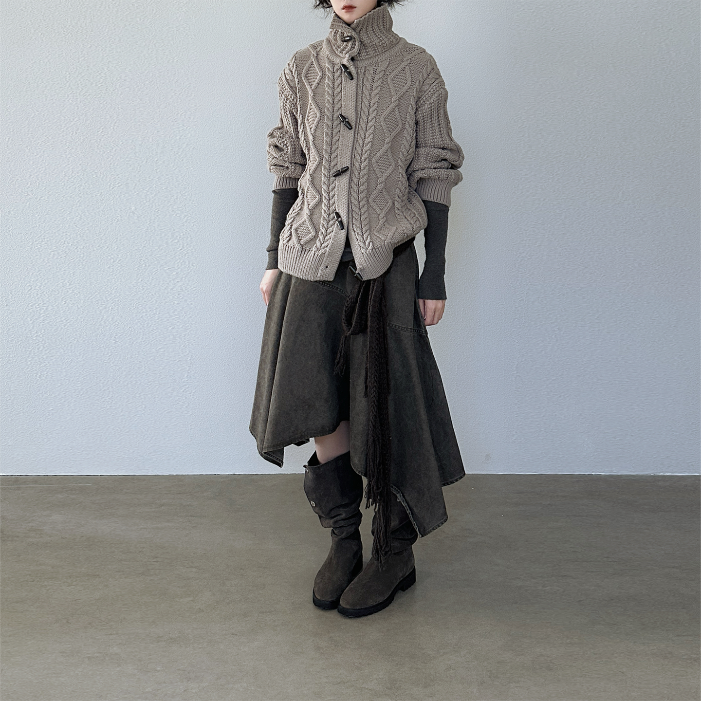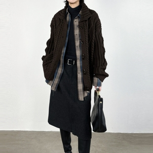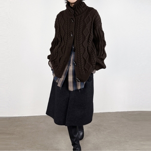 尢系UXI复古秋冬高领麻花纹针织开衫 女宽松羊毛毛衣纽扣针织外套