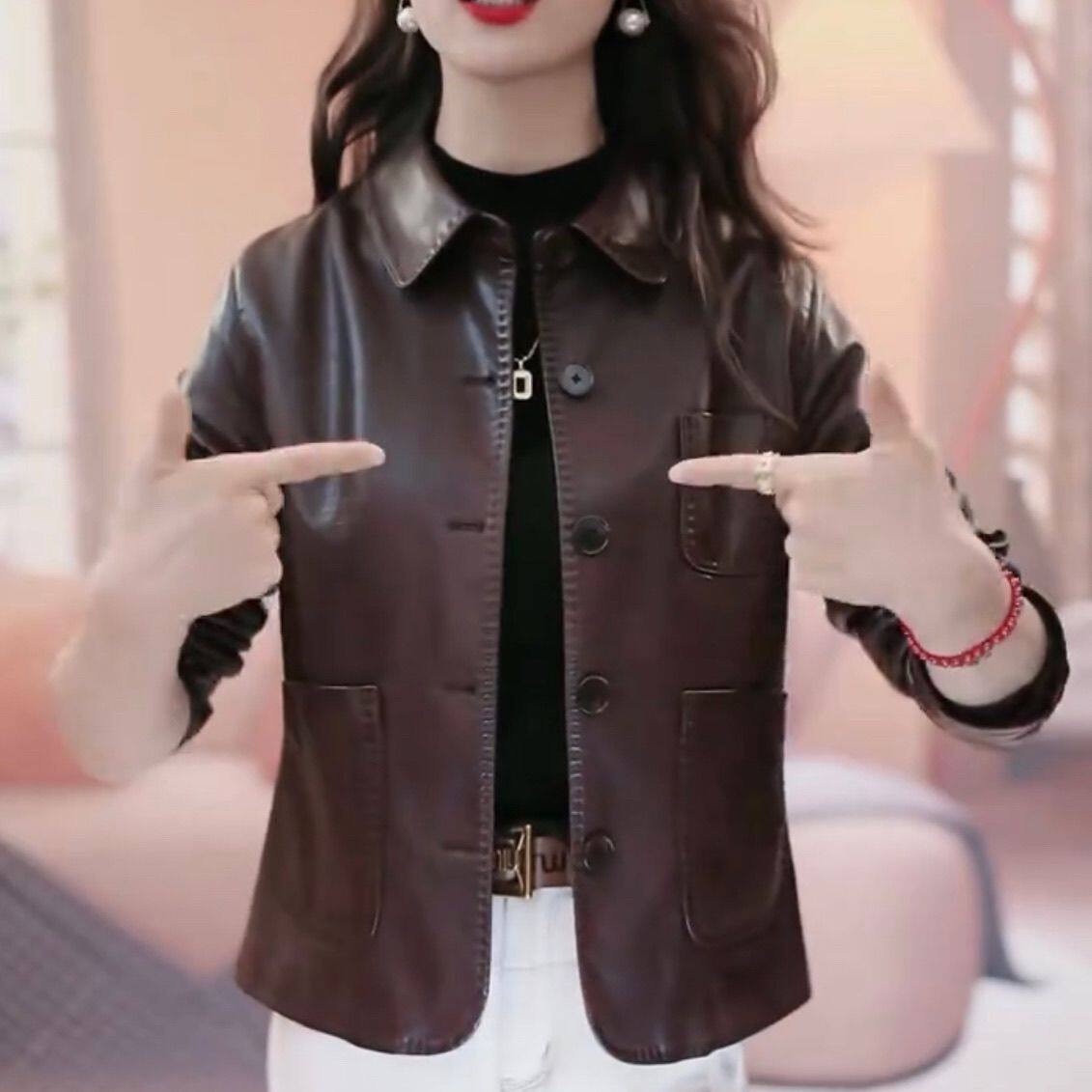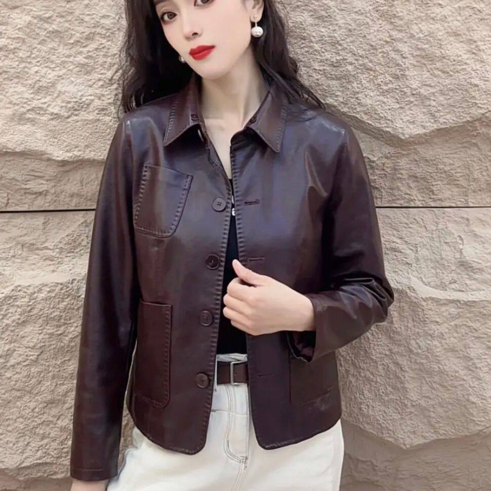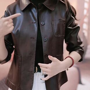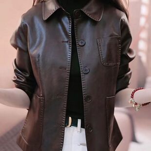 休闲复古翻领短款 海宁精品时尚 宽松小个子皮衣外套女 新款 2025秋季