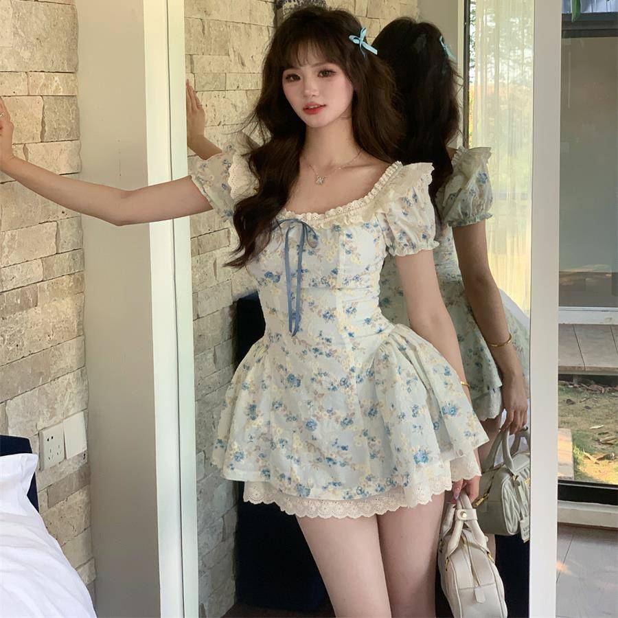 收腰蕾丝拼接蓝色碎花连衣裙公主夏季 法式 短裙 甜味氧气 越韩小鱼