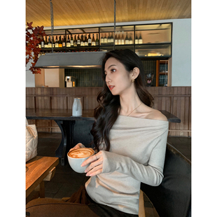 型 超赞版 一字肩上衣女修身 长袖 MULVAN 高级感露肩针织衫 强推