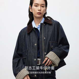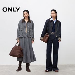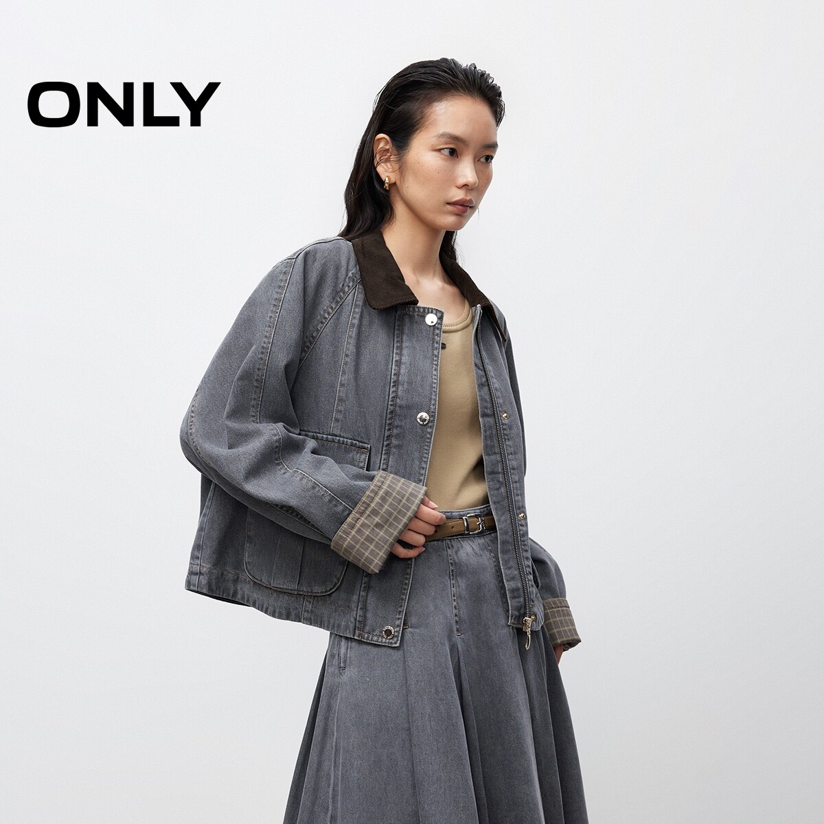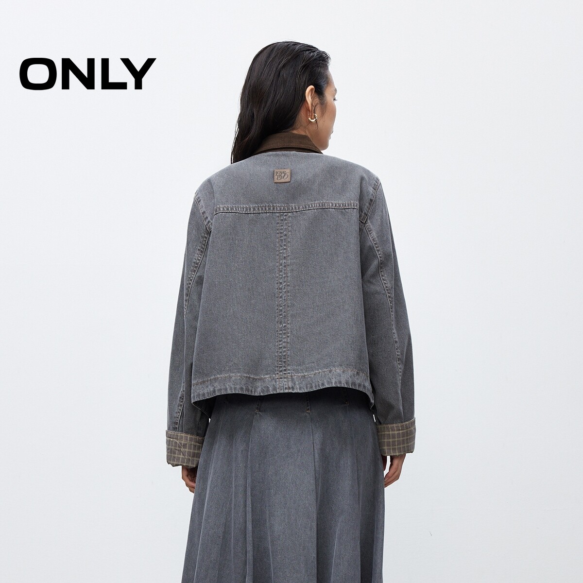 ONLY春季 风大口袋撞色条绒拼接领口翻领宽松插肩牛仔外套女 工装