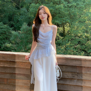 ByYou 蓝色荡领印花雪纺吊带背心女收腰露肩不规则下摆上衣 春新款