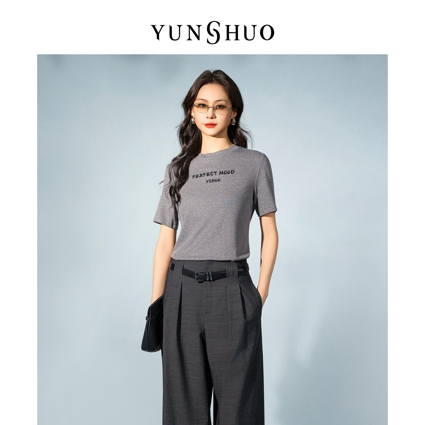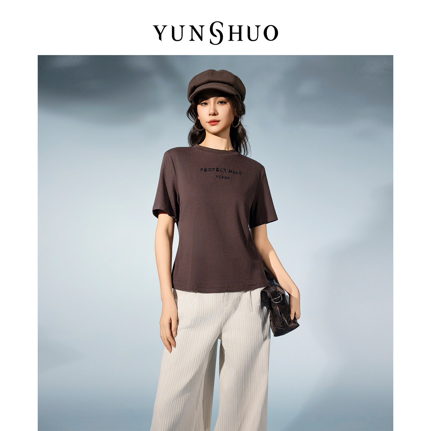 允硕新品 正肩套头女T恤纯色百搭出街上衣345210 圆领字母刺绣修身