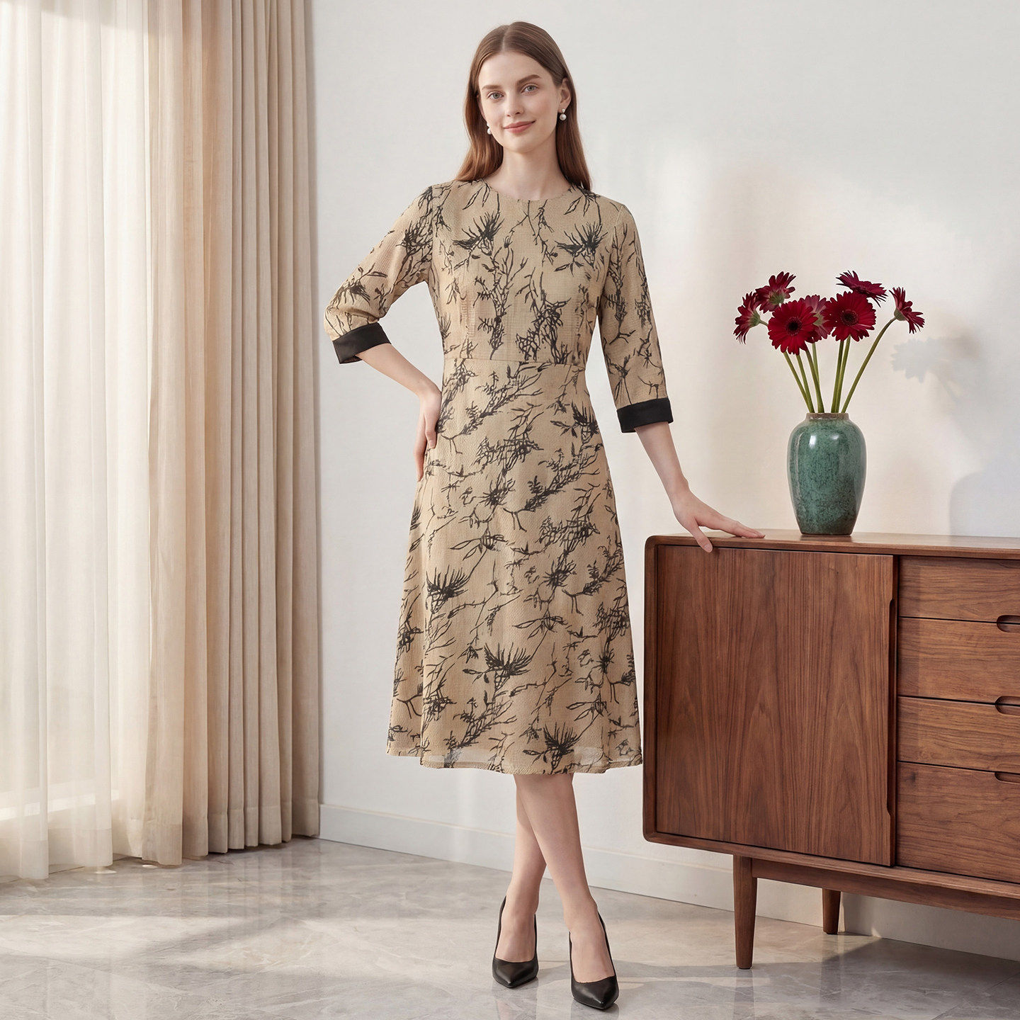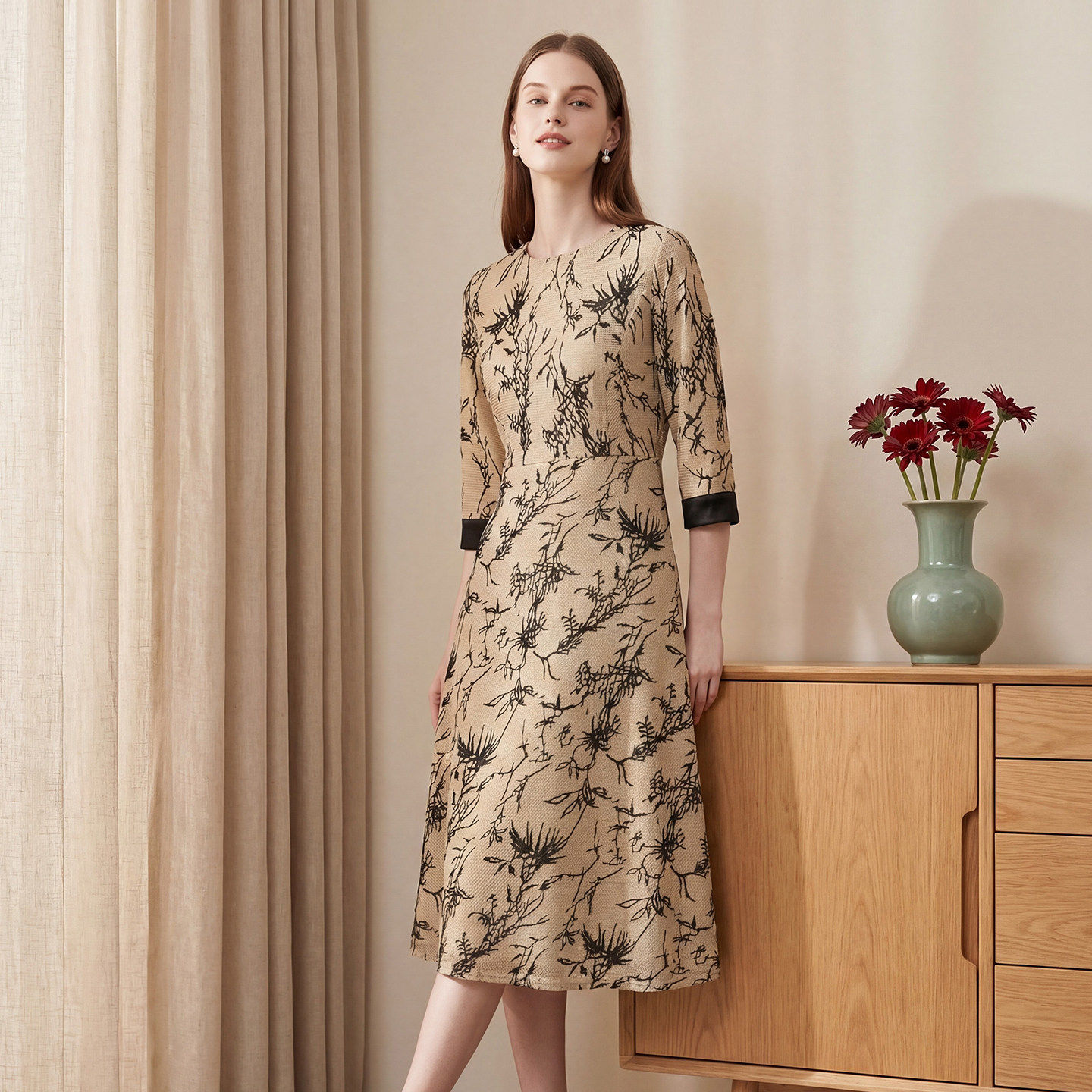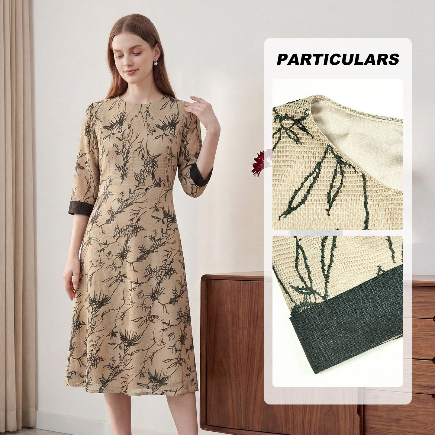 马天奴2026春夏新款 优雅女 绿色印花圆领收腰连衣裙子国风气质时尚