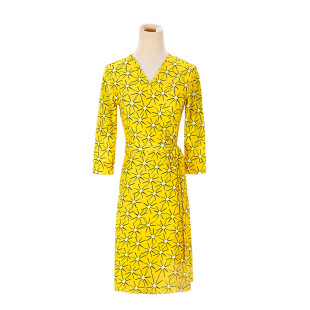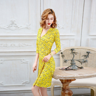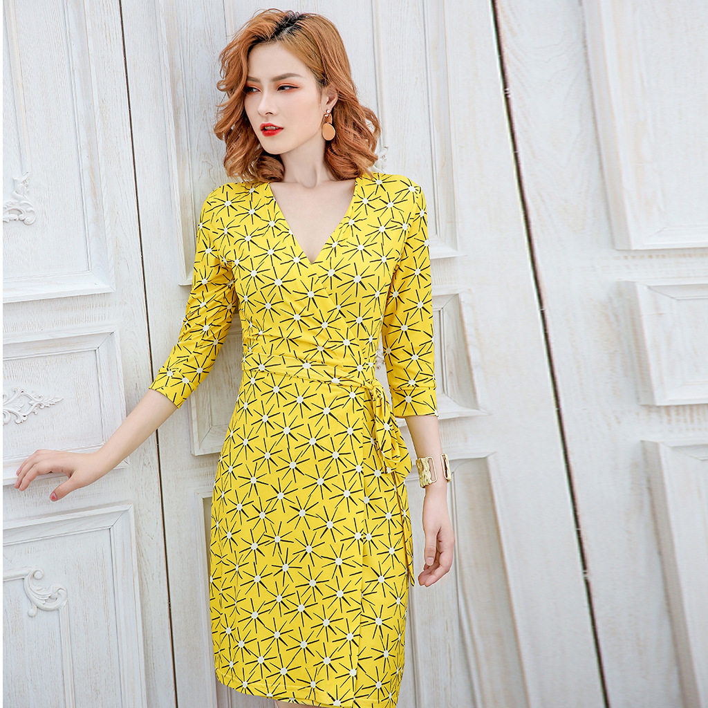 DVF2026 显瘦黄色太阳花印花度假裹身裙女PG 欧美新品 连衣裙修身
