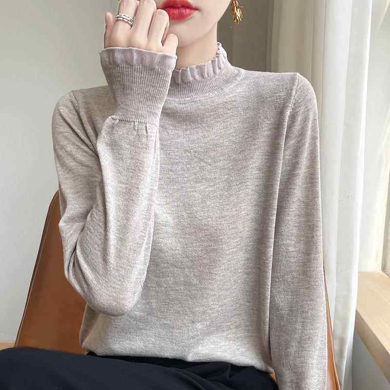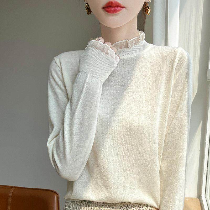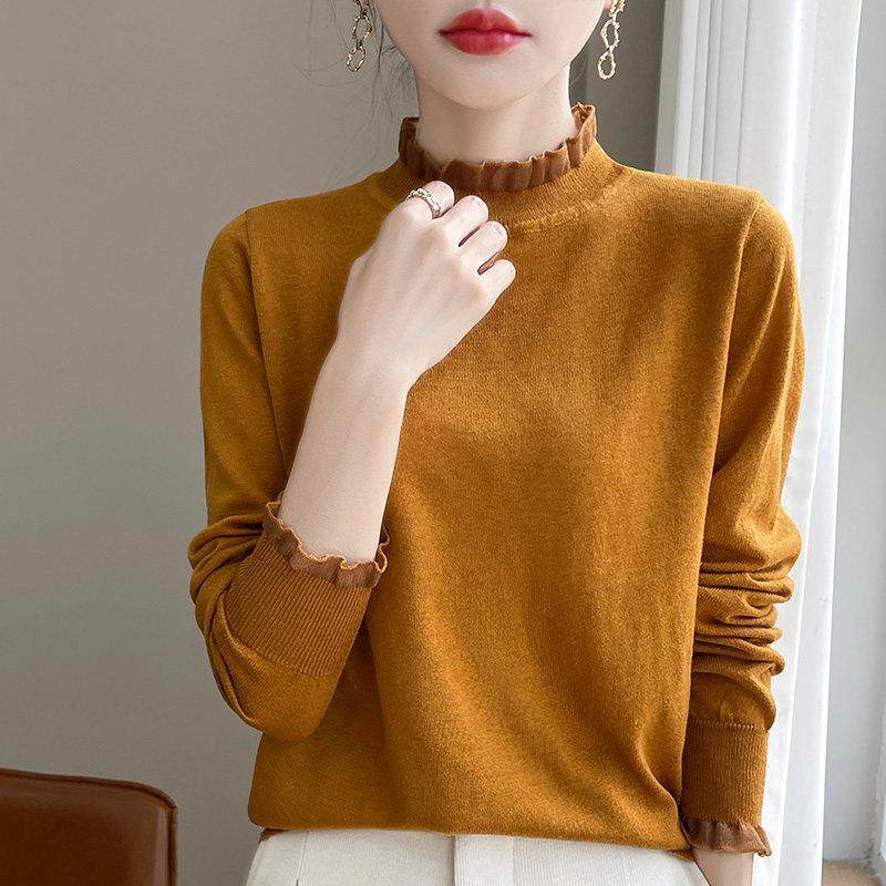 2025新款 秋冬舒适轻薄感针织1219e 蕾丝木耳边高领女士打底衫