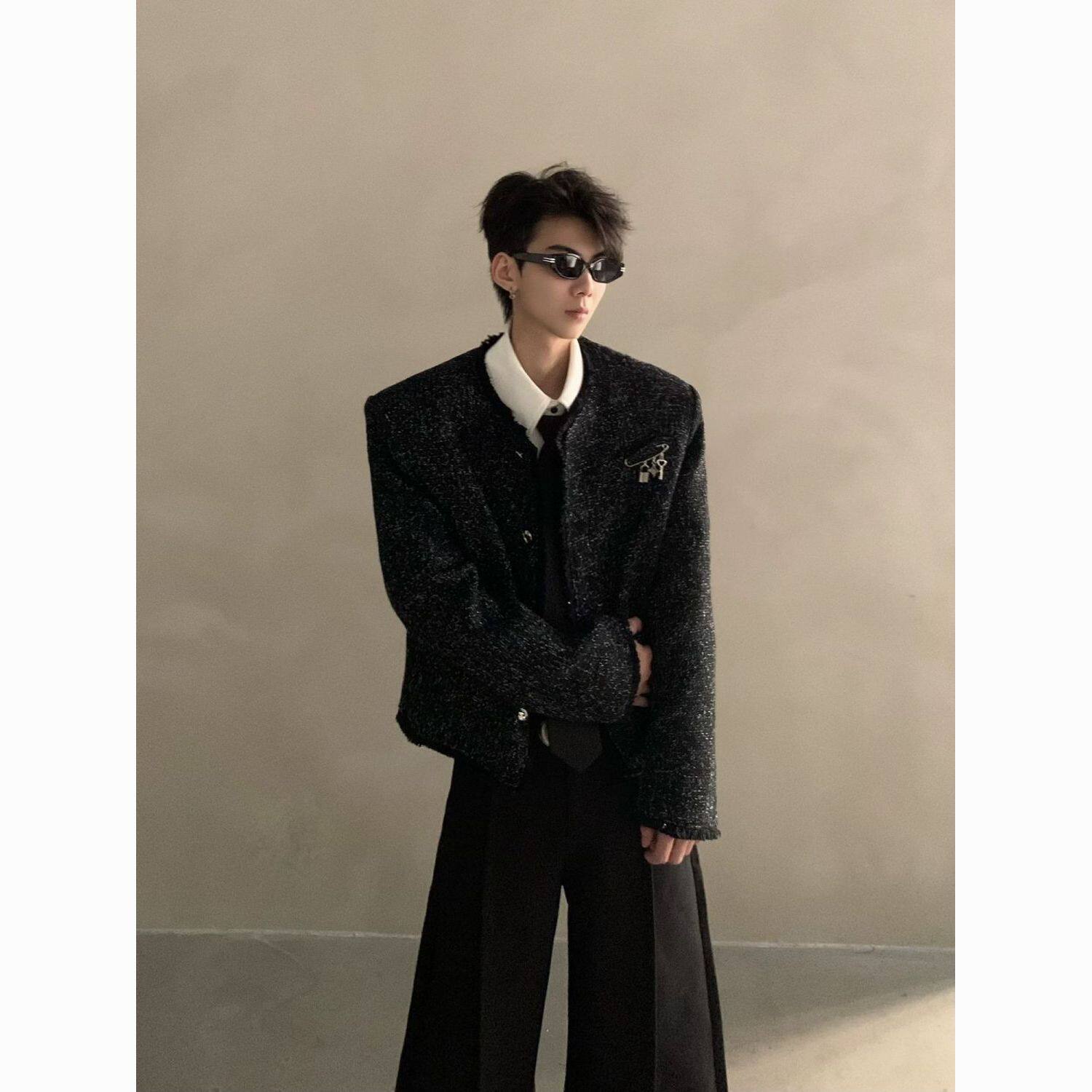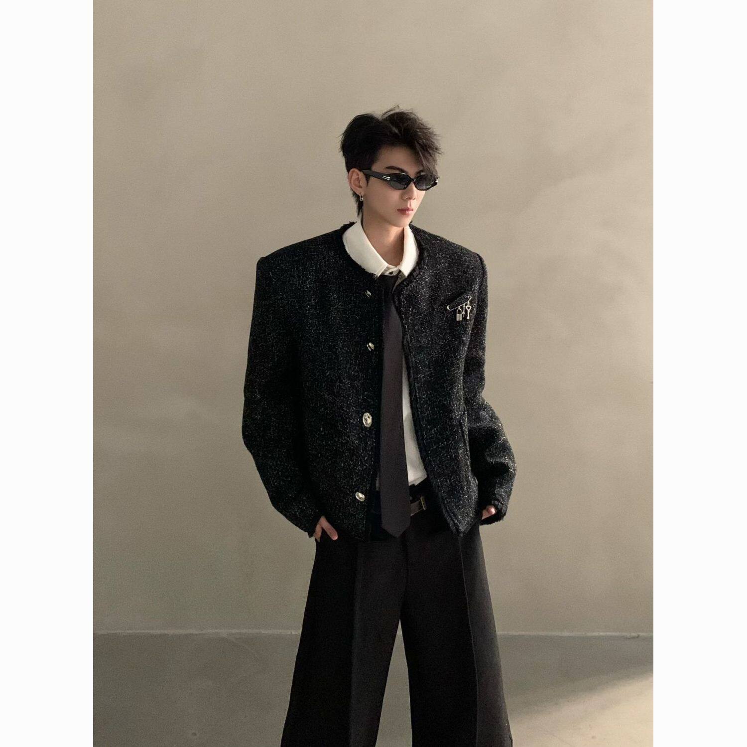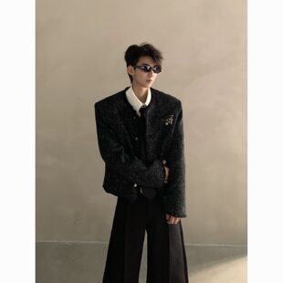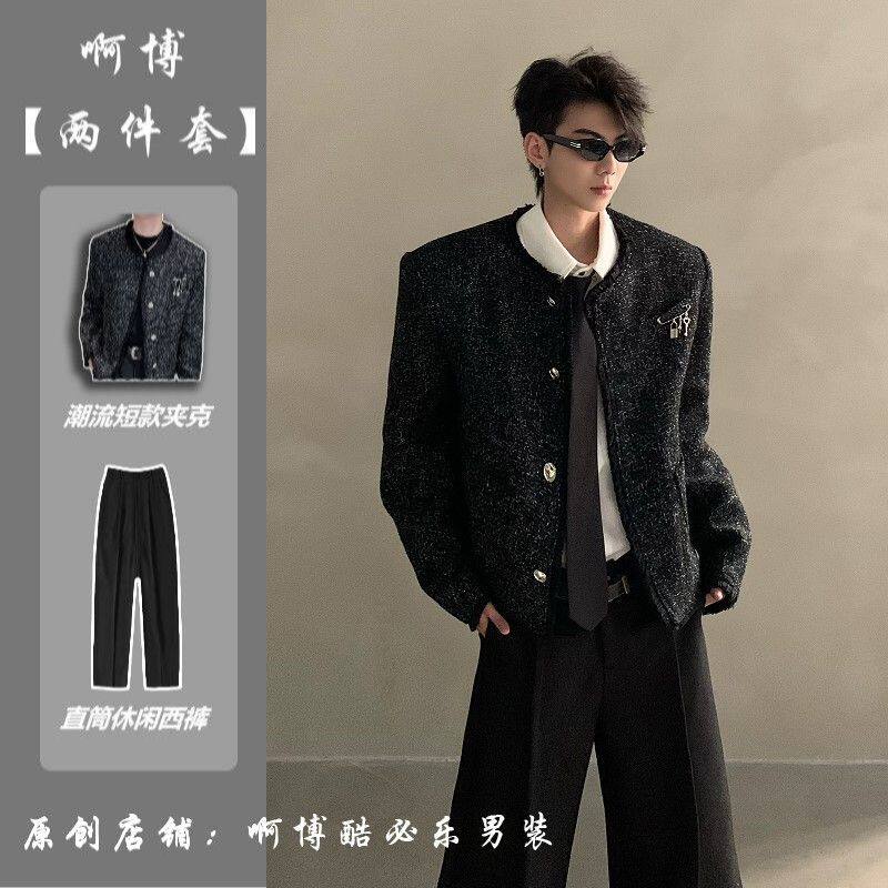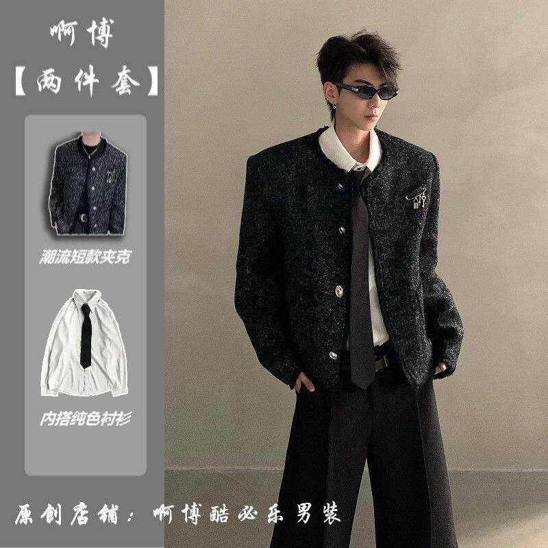 轻奢小香风短款 无领编织小西服 夹克痞帅高级感男模穿搭一整套韩版