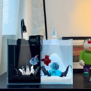 黑白双格鱼缸小型客厅新款 斗鱼专用缸桌面全套造景恒温超白玻璃缸