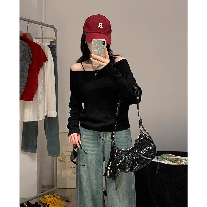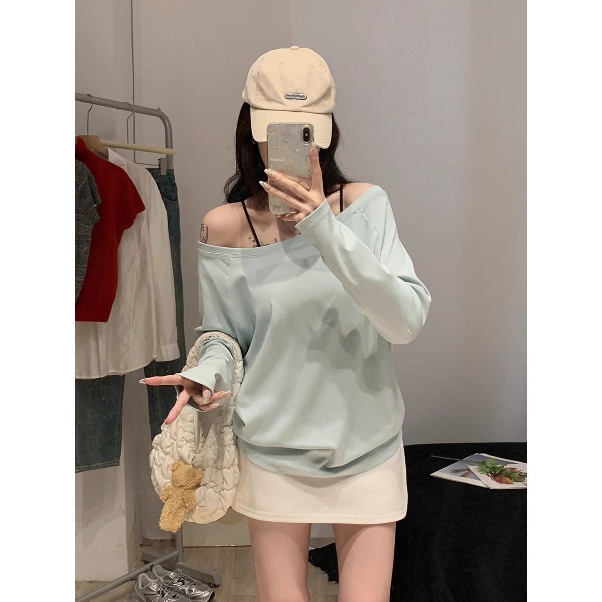 白色一字肩磨毛长袖 T恤女秋冬宽松慵懒斜肩打底内搭露肩加绒上衣