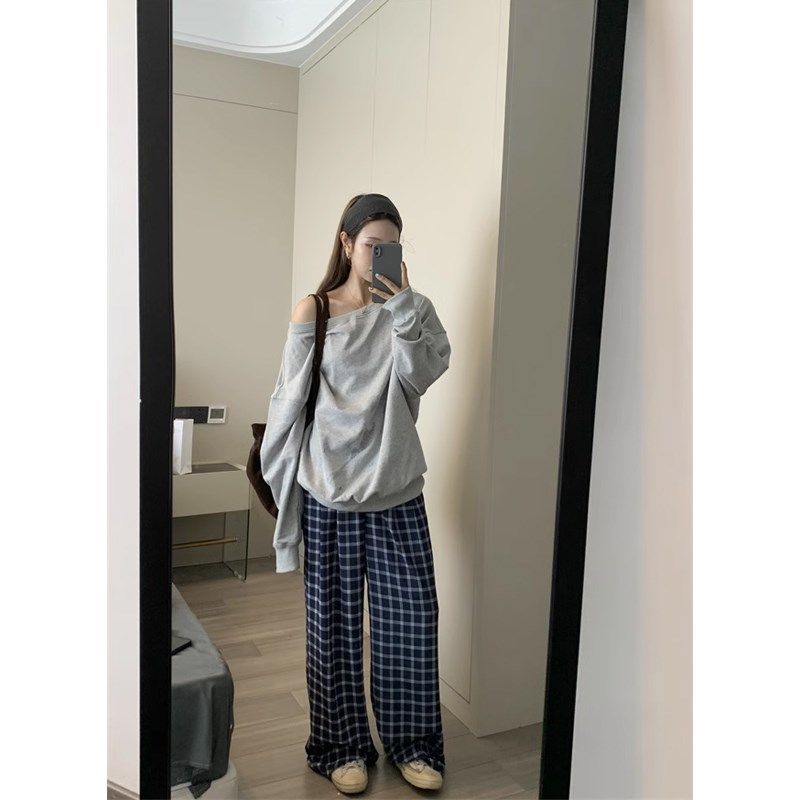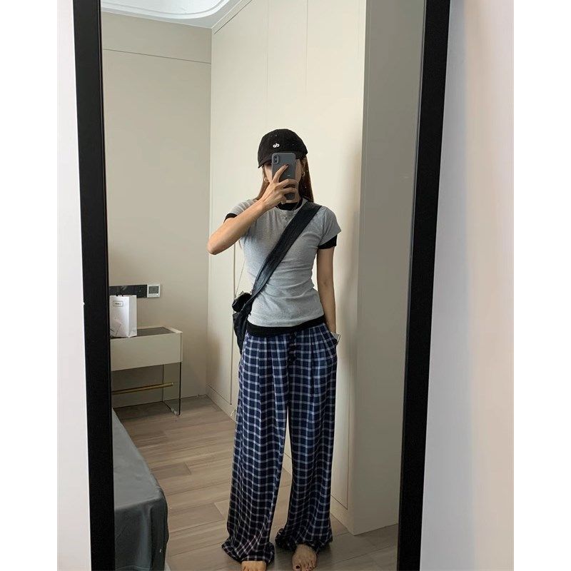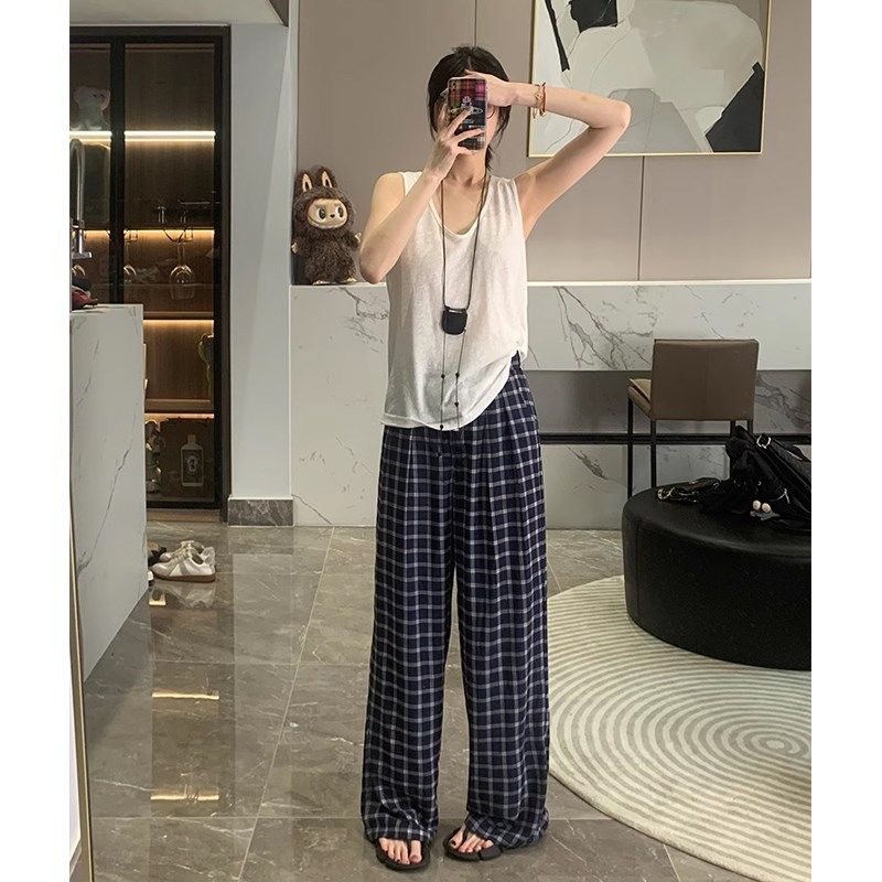 百搭垂感休闲直筒长裤 蓝色宽松阔腿裤 子 春秋季 孕妇慵懒格子拖地裤
