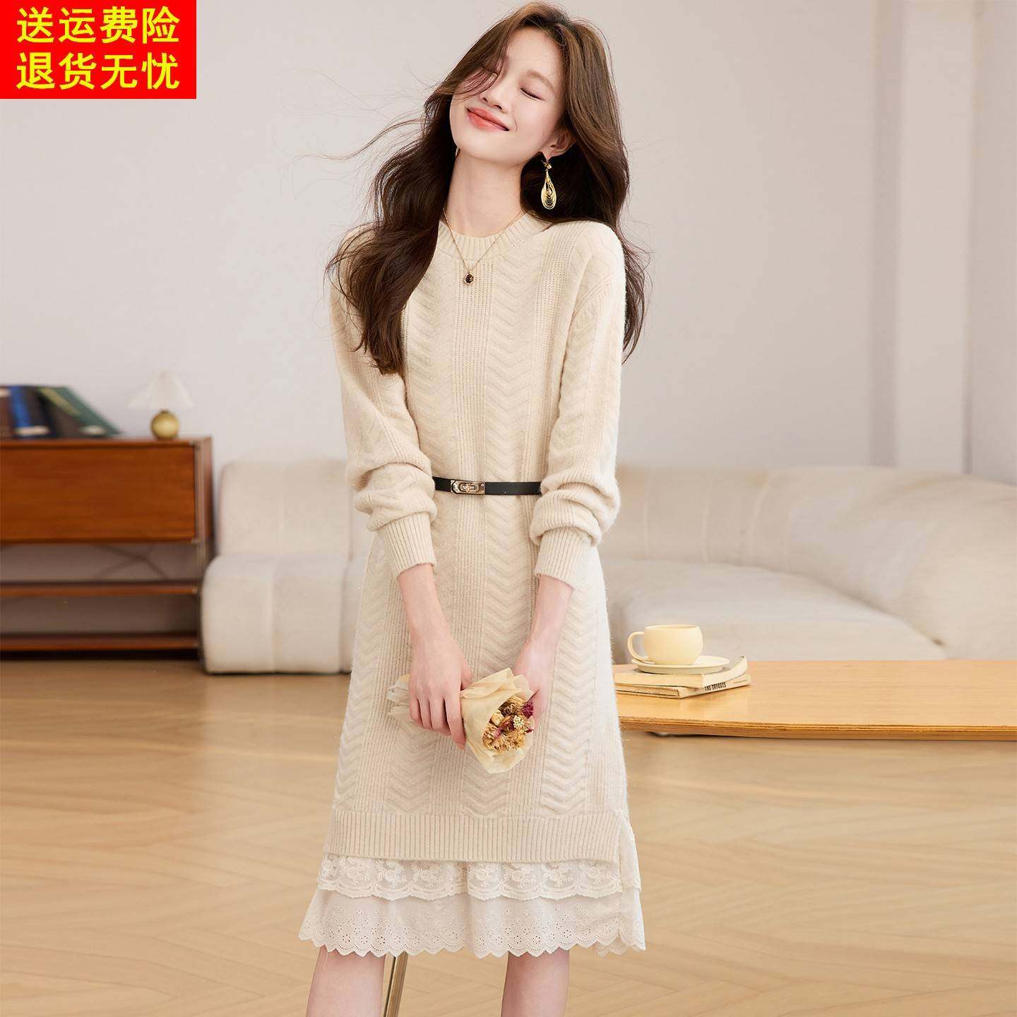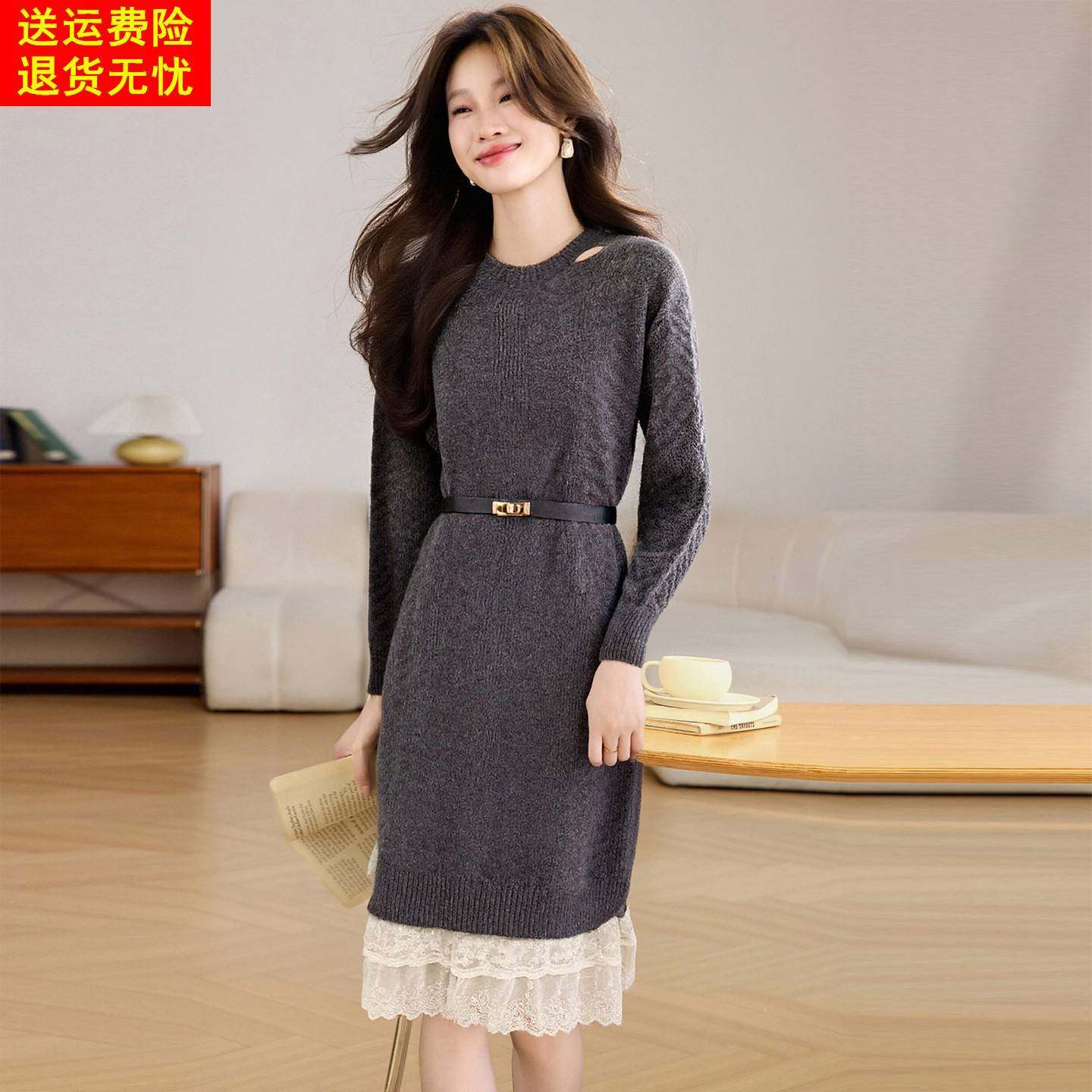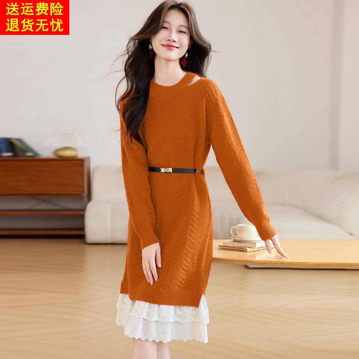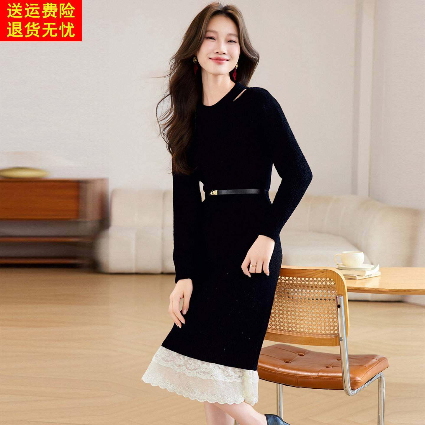 蕾丝拼接针织连衣裙2025秋冬新款 打底毛衣长裙 气质显瘦红色中长款