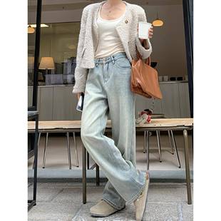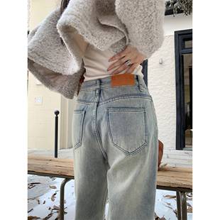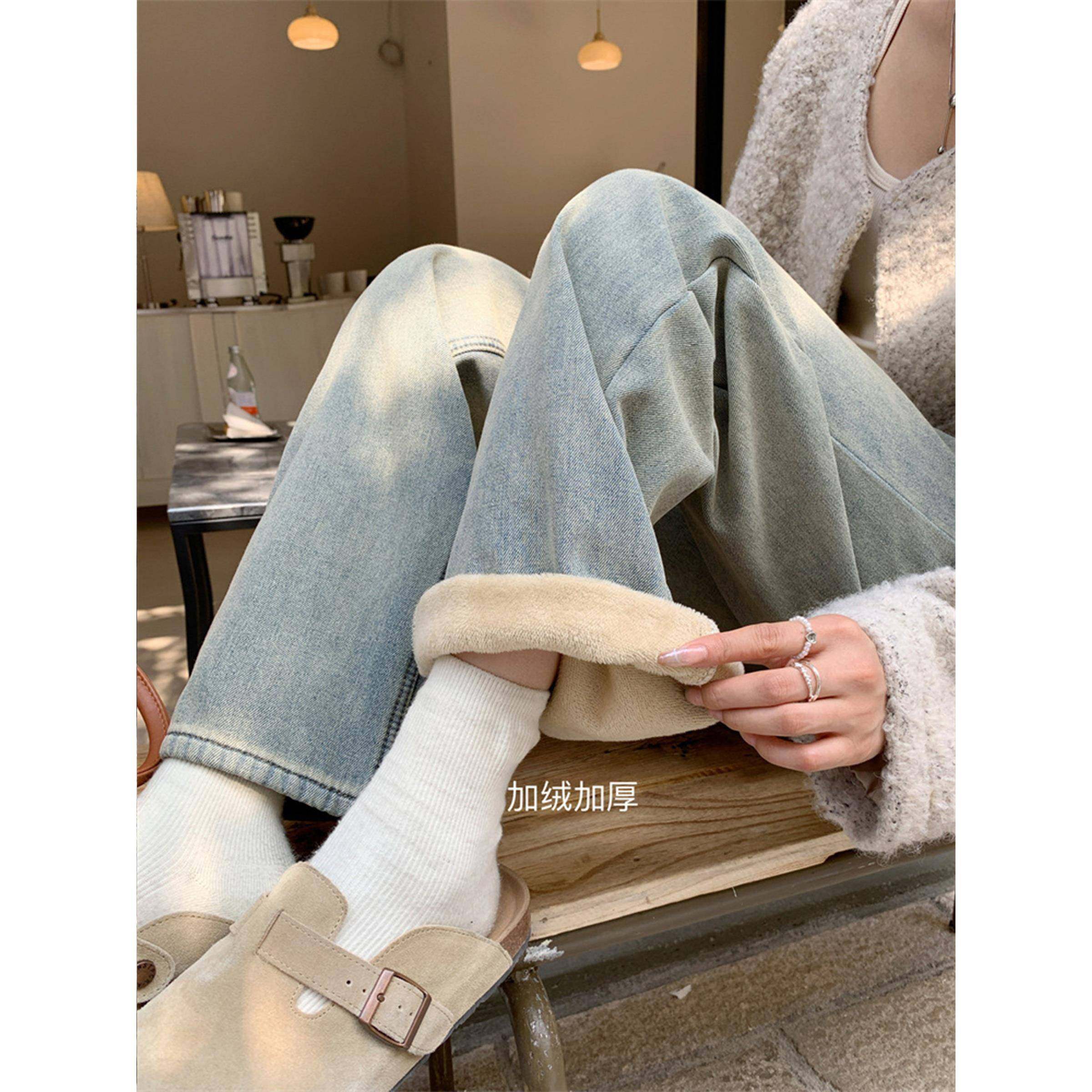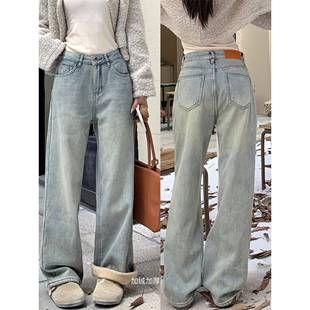 宽松保暖加绒阔腿裤 女2024秋冬新款 潮 蓝色显瘦高腰直筒牛仔裤 韩版