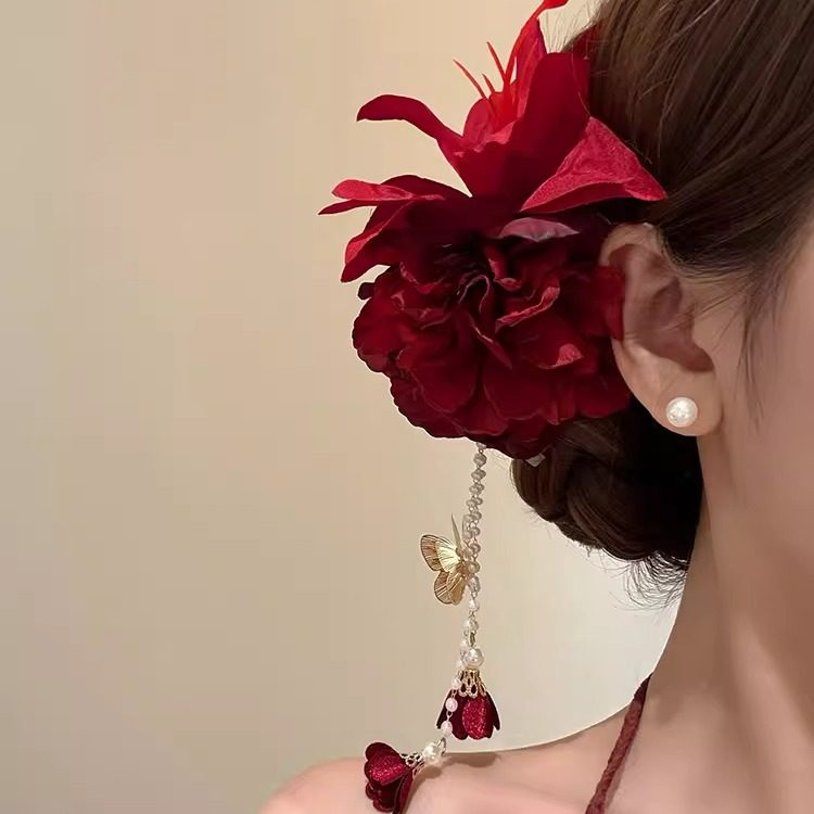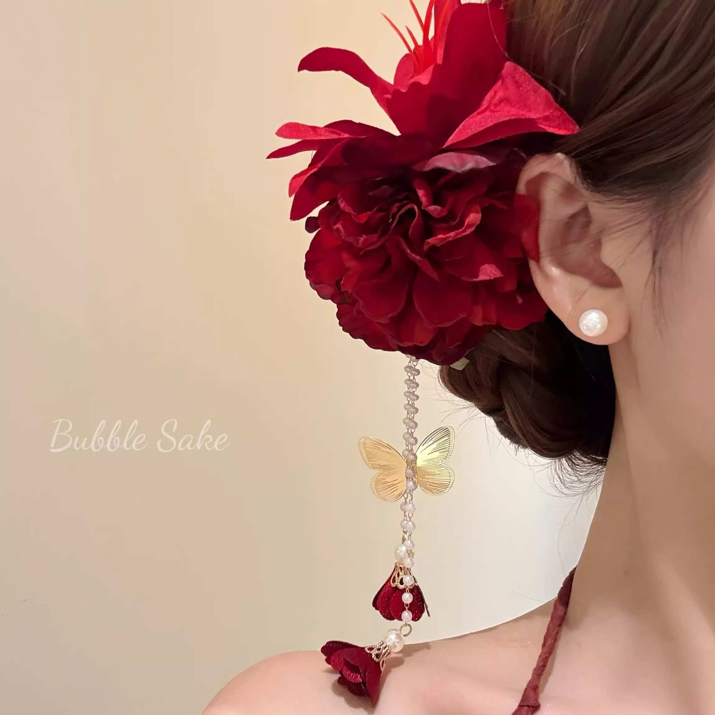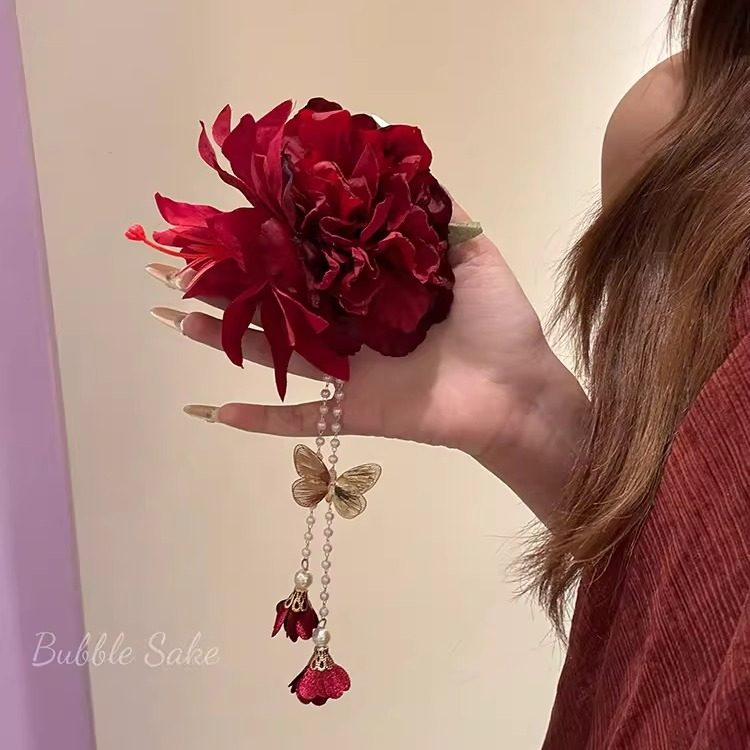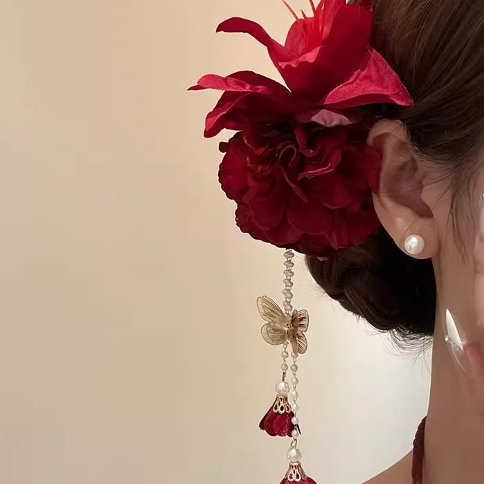 氛围感红色花朵蝴蝶流苏发夹夏日海边侧边夹子盘发头花