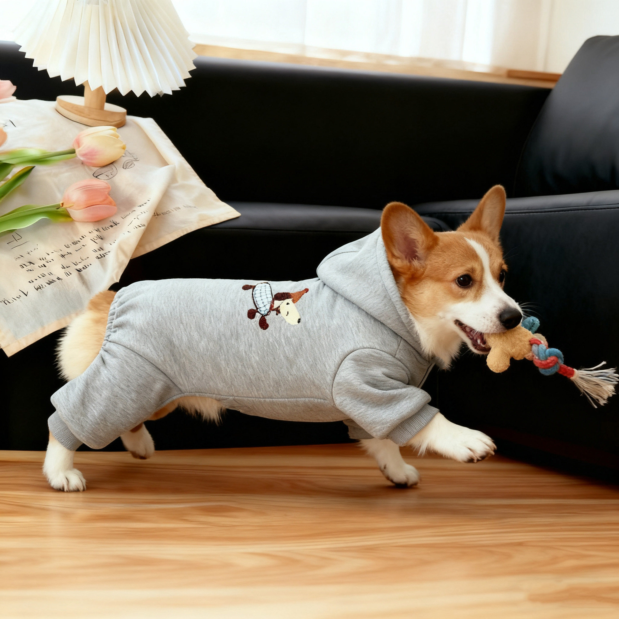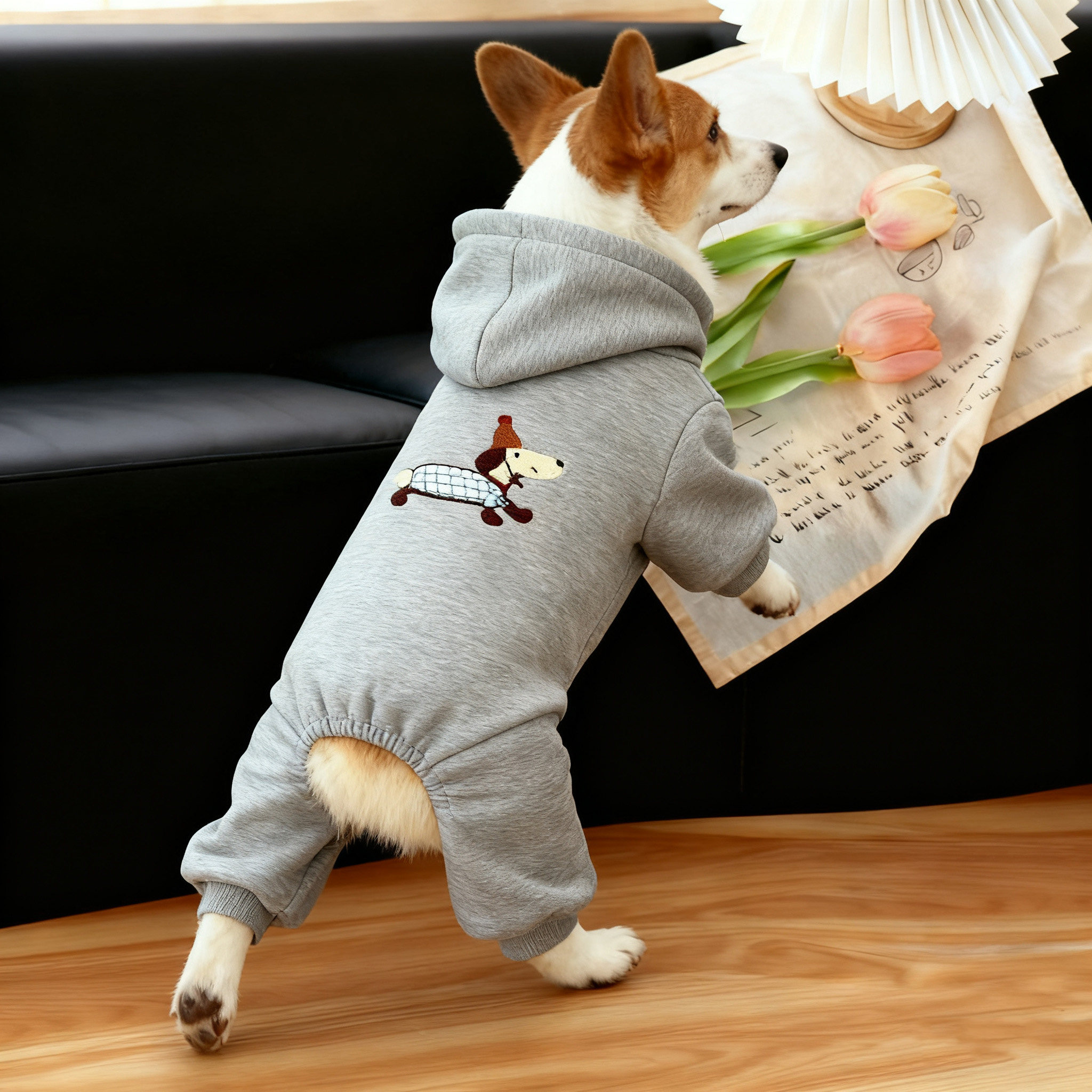 狗衣服冬季 灰色卡通小狗刺绣秋冬中型犬柯基法斗保暖连帽四脚衣