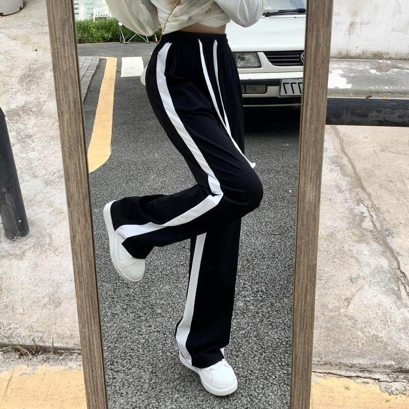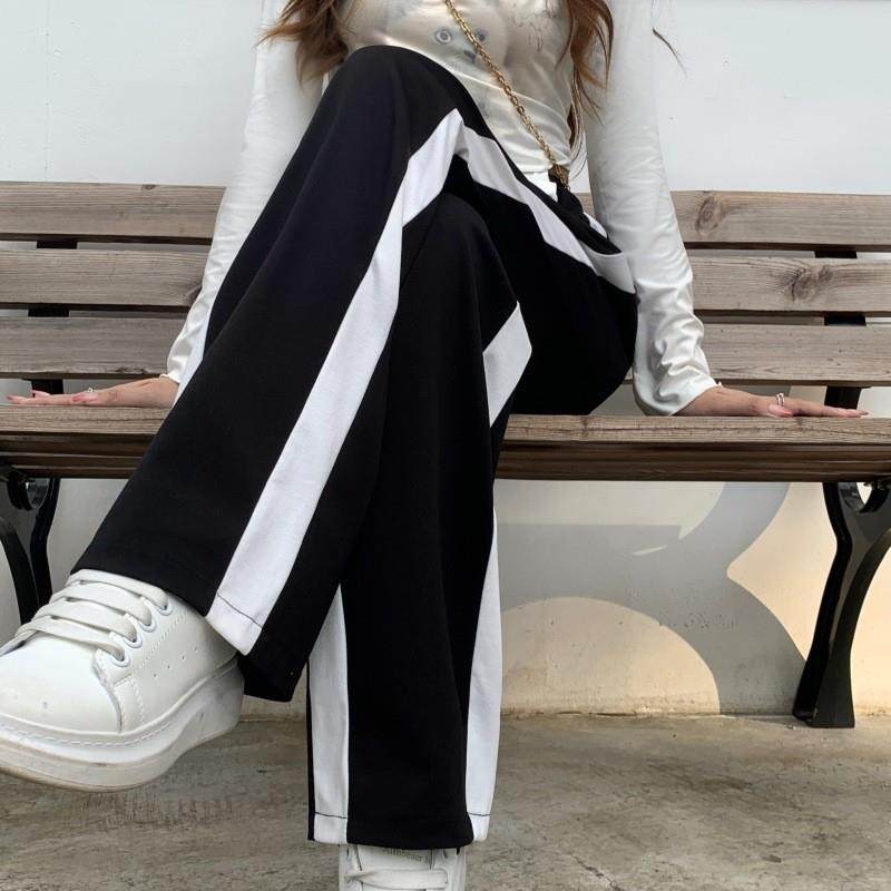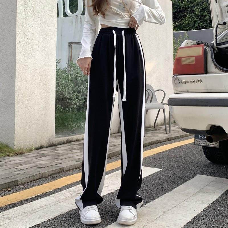 大鱼鳞 秋装 女薄款 实拍 高腰阔腿裤 实价 黑白撞色休闲裤 383 新款