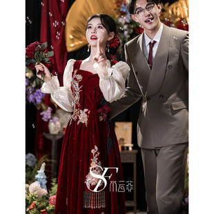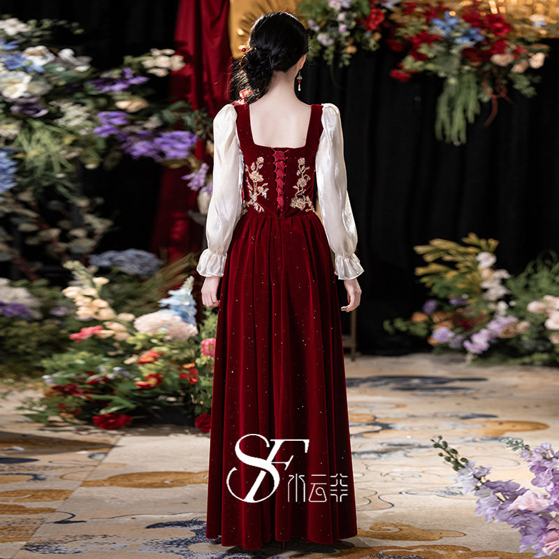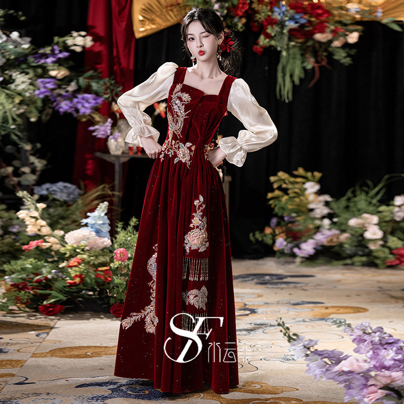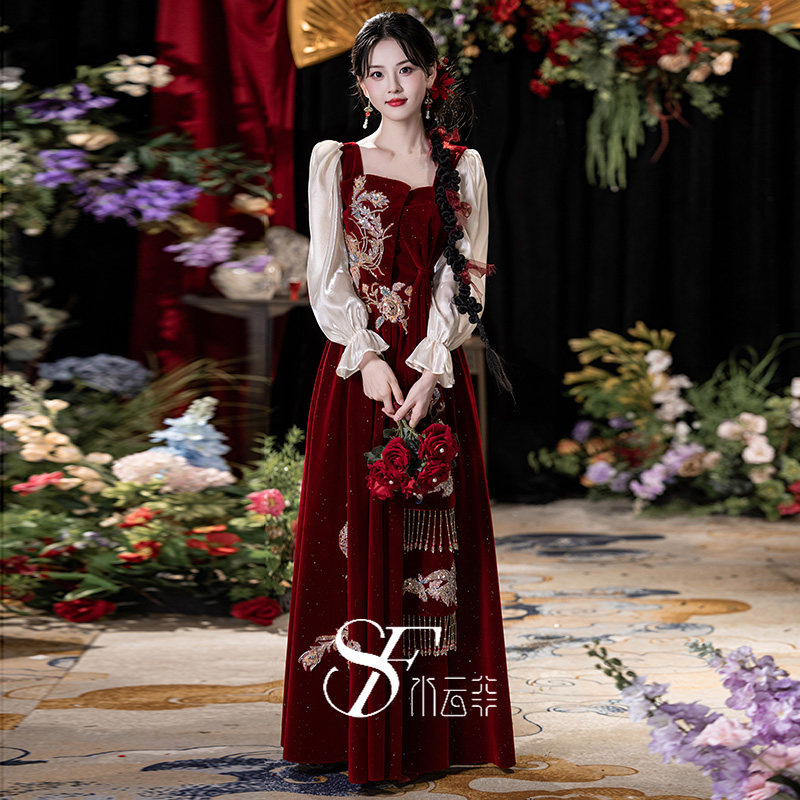 红色丝绒高端大气订婚礼服女 优雅气质长袖 敬酒服新娘冬季 2025新款