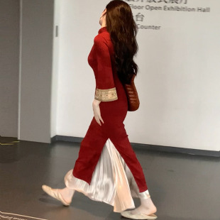 她来了复古馆订婚结婚年会显白气质酒红色暗纹提花倒大袖 复古旗袍