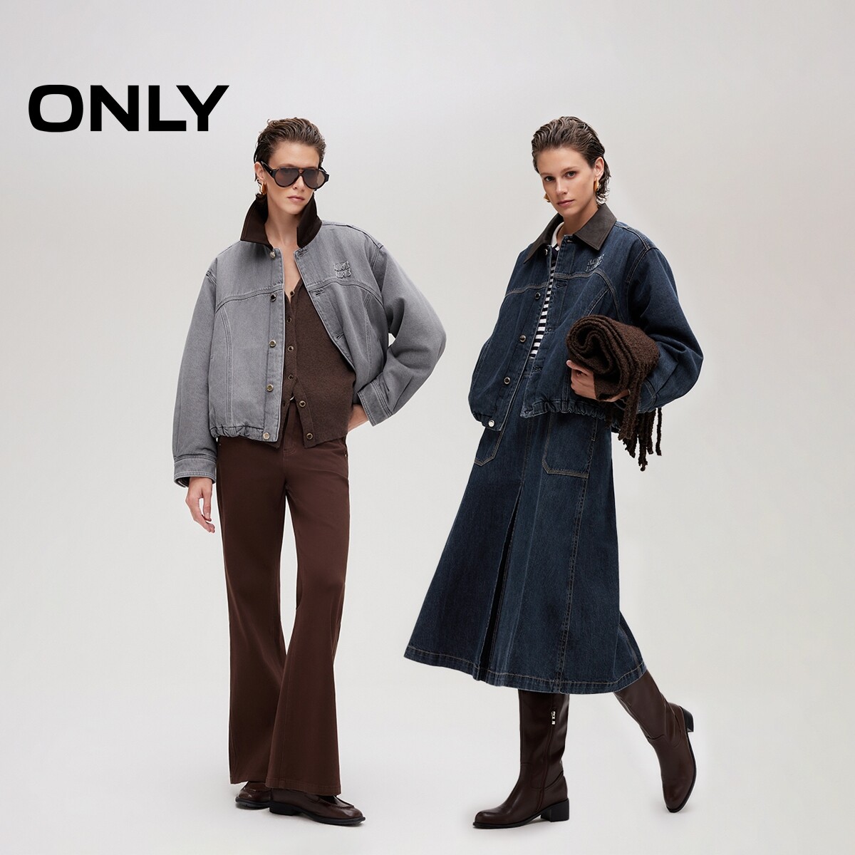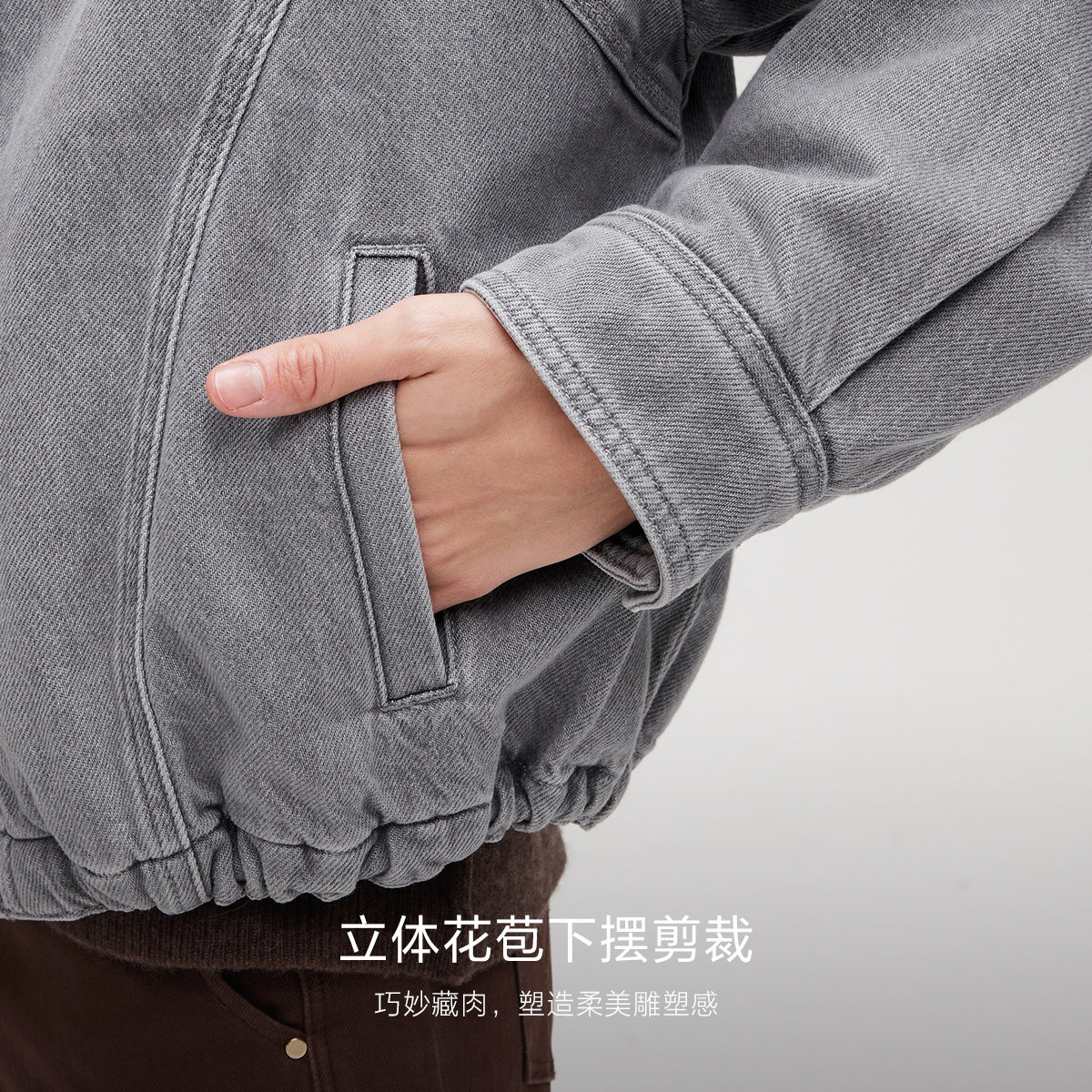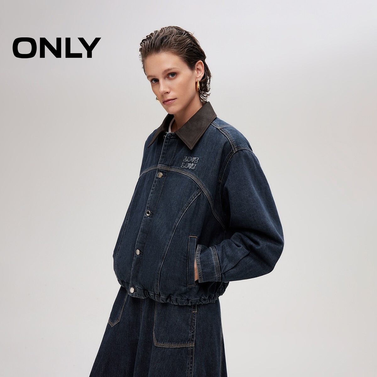 绫致ONLY秋季 落肩皮领拼接夹克花苞下摆纯棉短外套女 新款