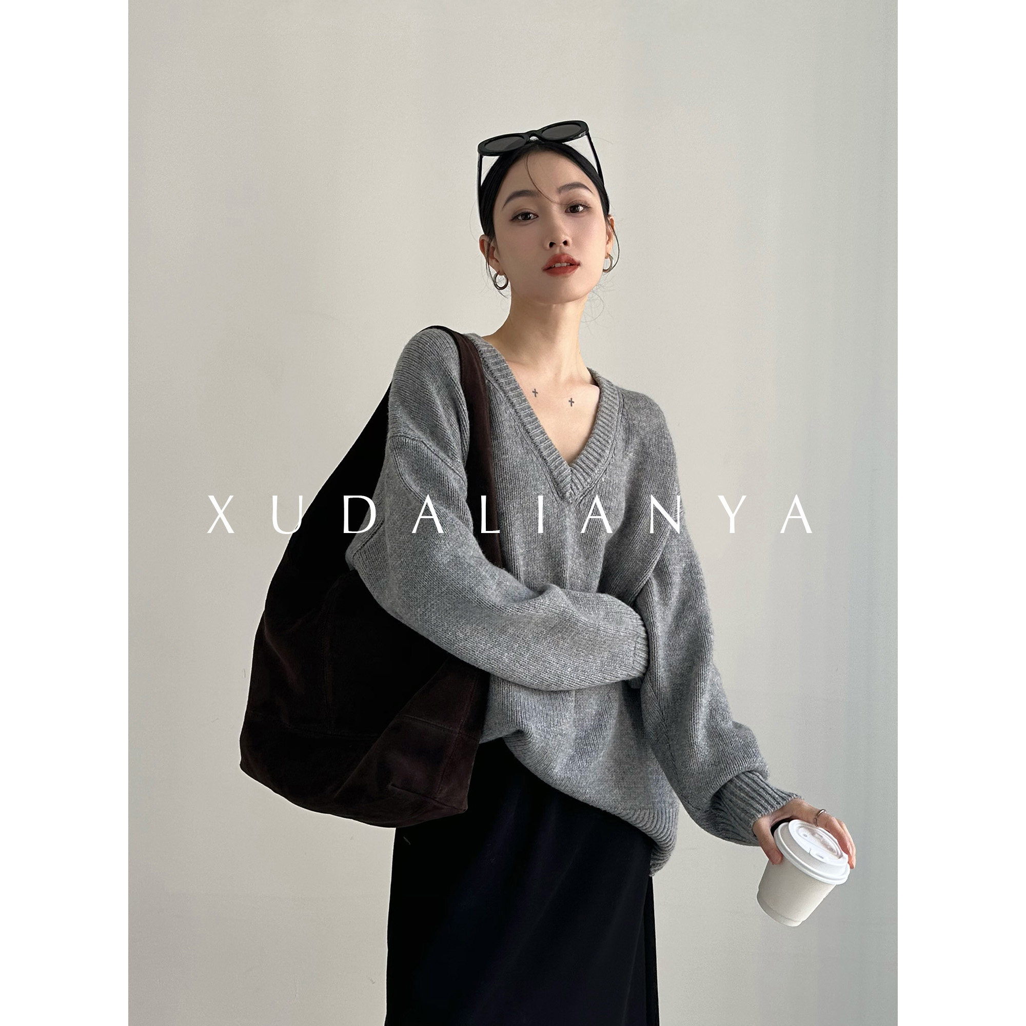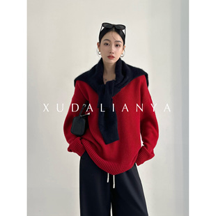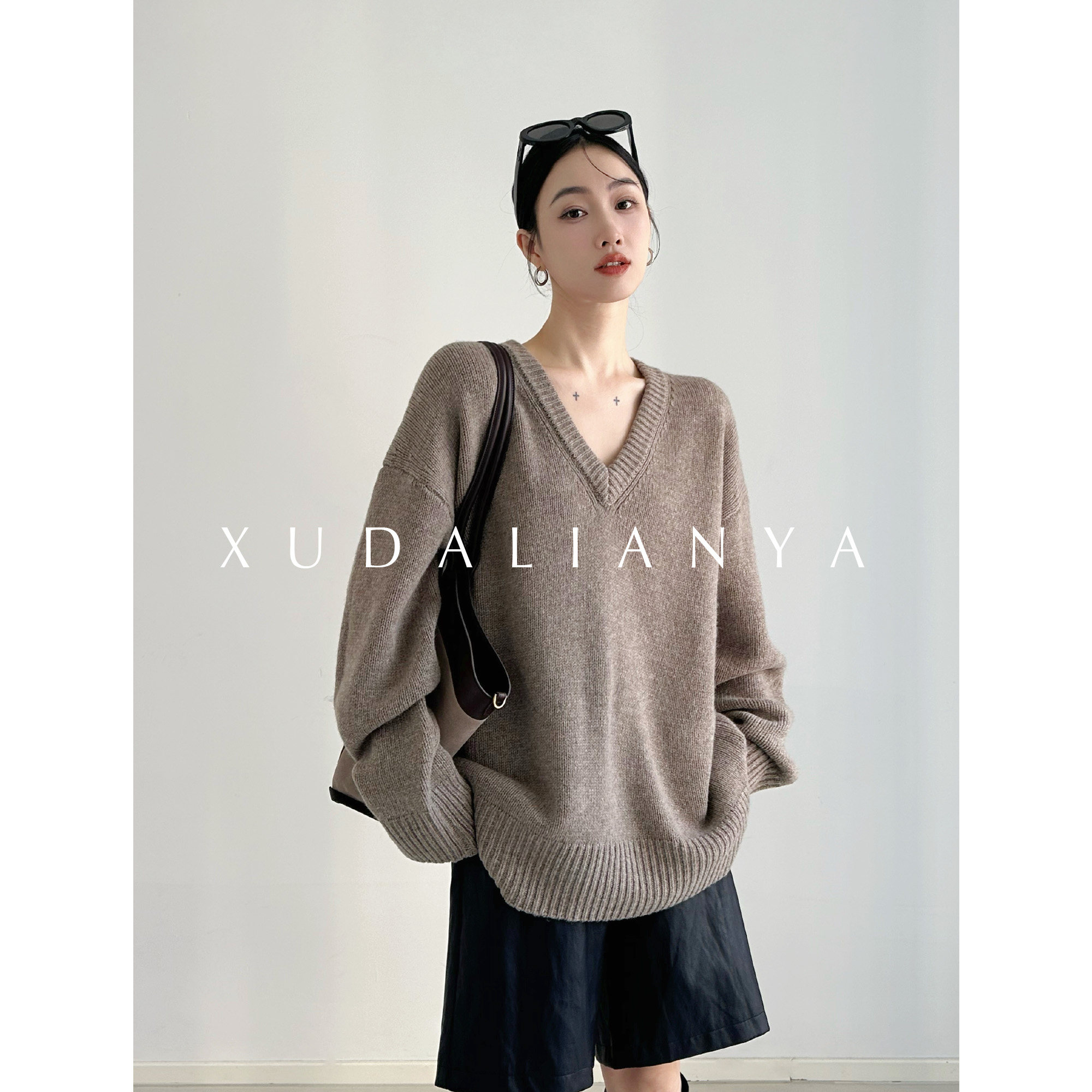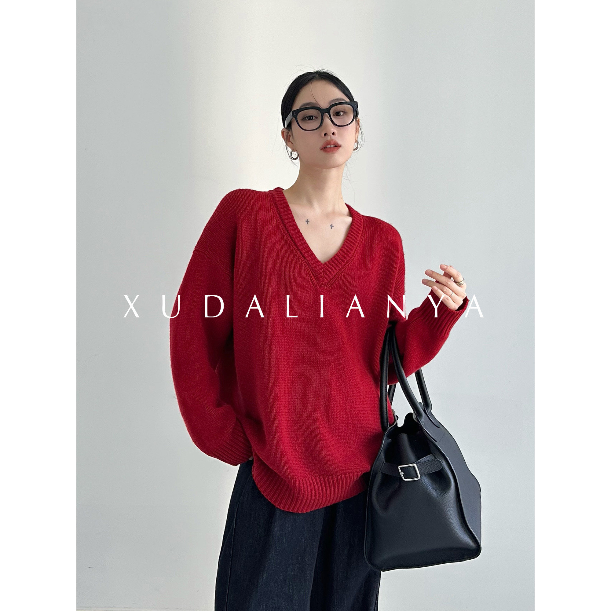 徐大脸吖定制 重磅100%澳洲绵羊毛密实针织秋冬大廓形V领红毛衣女