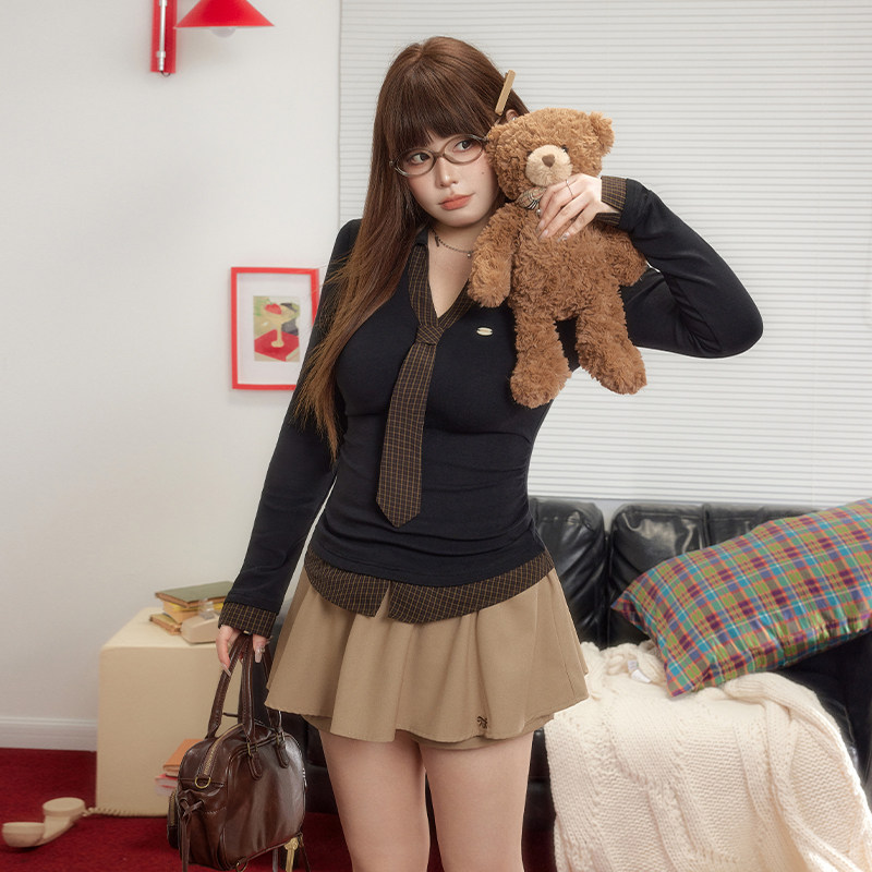 裙 裤 UNIFREEPLUS大码 低腰miu系半身裙女学院风假两件显瘦蓬蓬西装