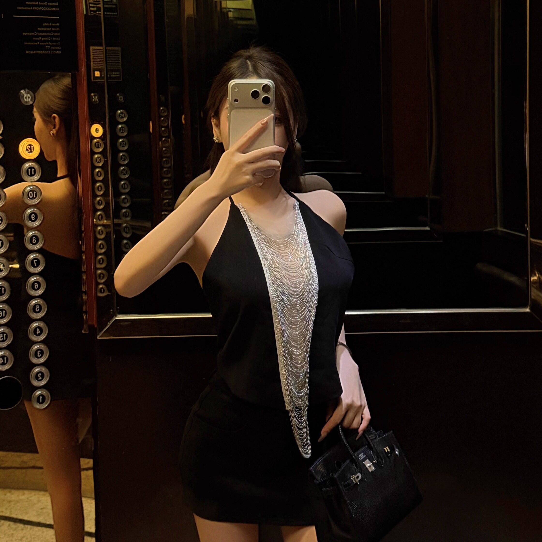 MIMIWU 水钻挂脖吊带银河流苏内搭大露背拼接上衣