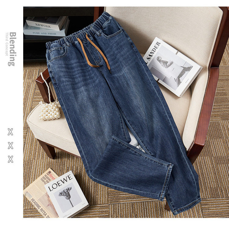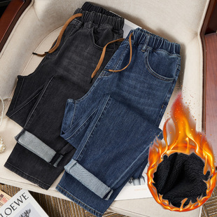 2025新款 女款 秋冬加绒 女松紧腰带老爹裤 胖mm松紧腰大连欧货牛仔裤