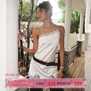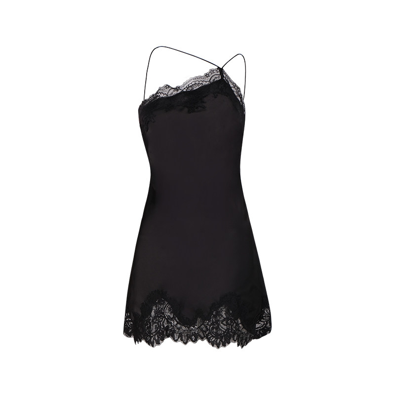 ITSNIKAR 黑色蕾丝缎面斜肩连衣裙女秋性感镂空包臀裙垂感短裙子
