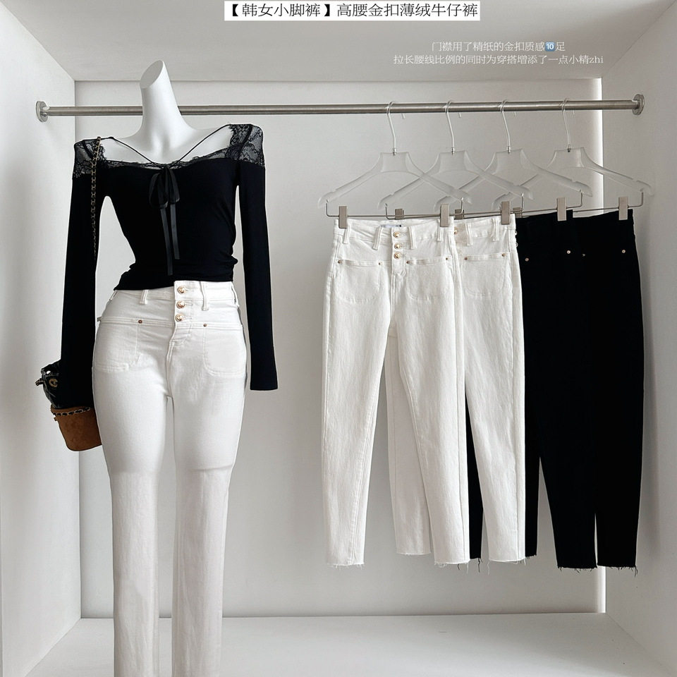 子 女秋冬内里抓绒显瘦九分牛仔裤 韩女小脚裤 白色高腰加绒烟管裤