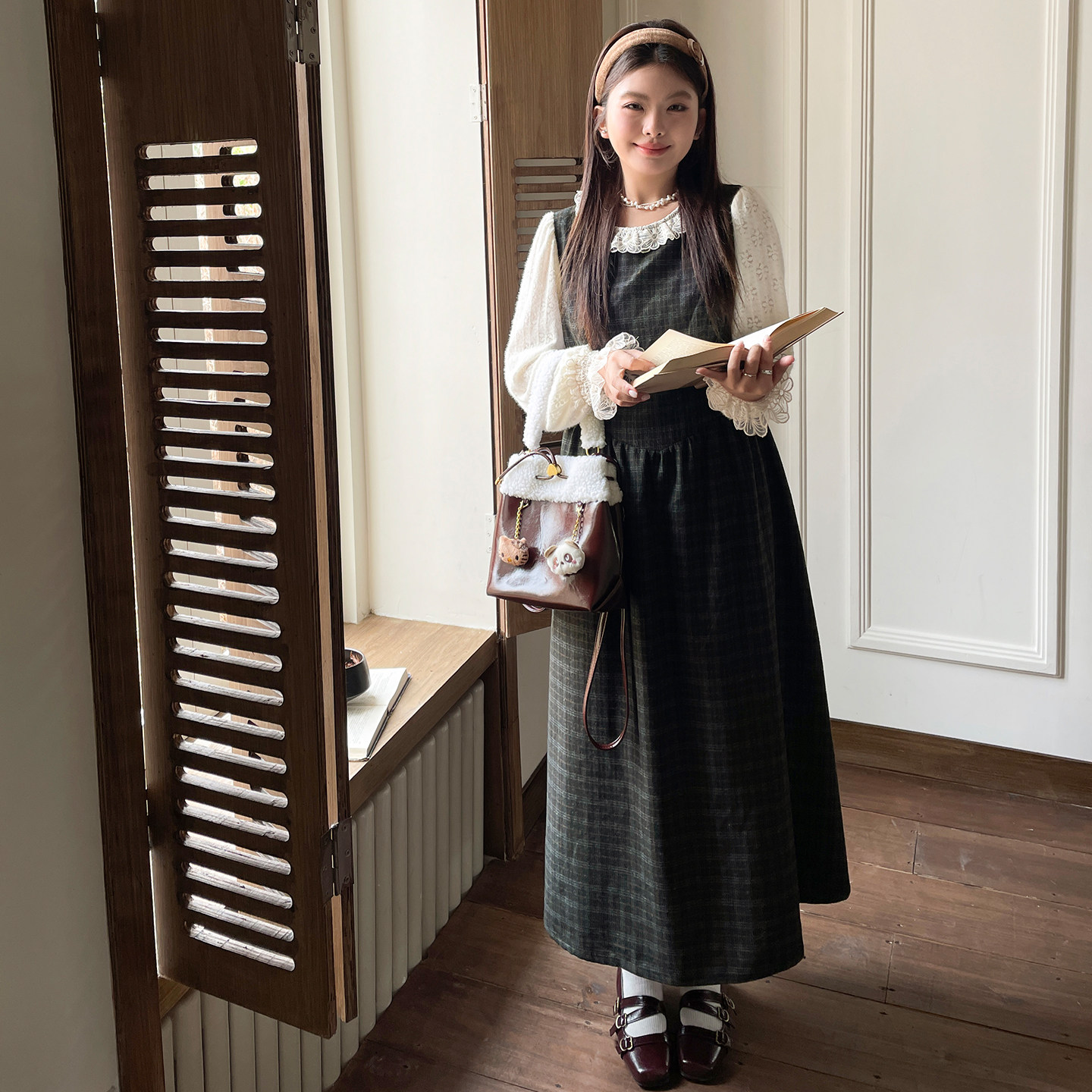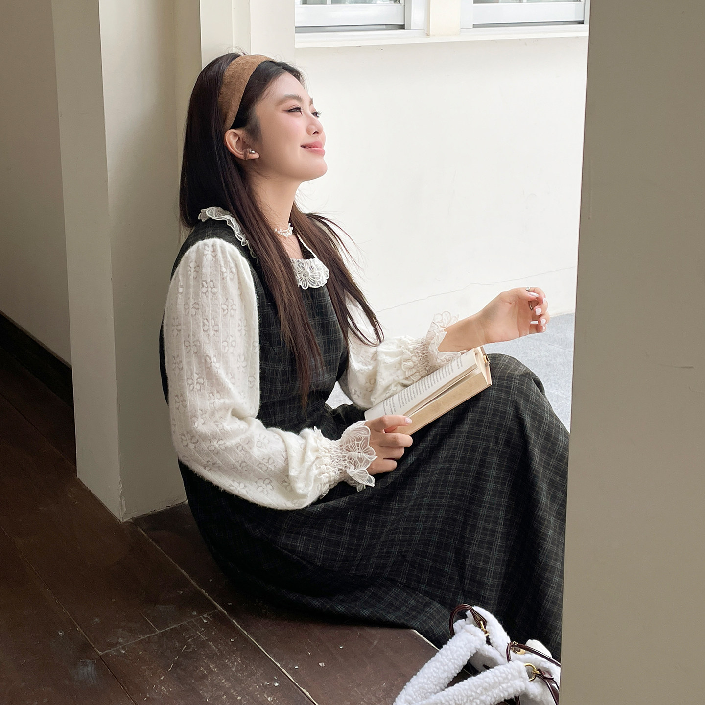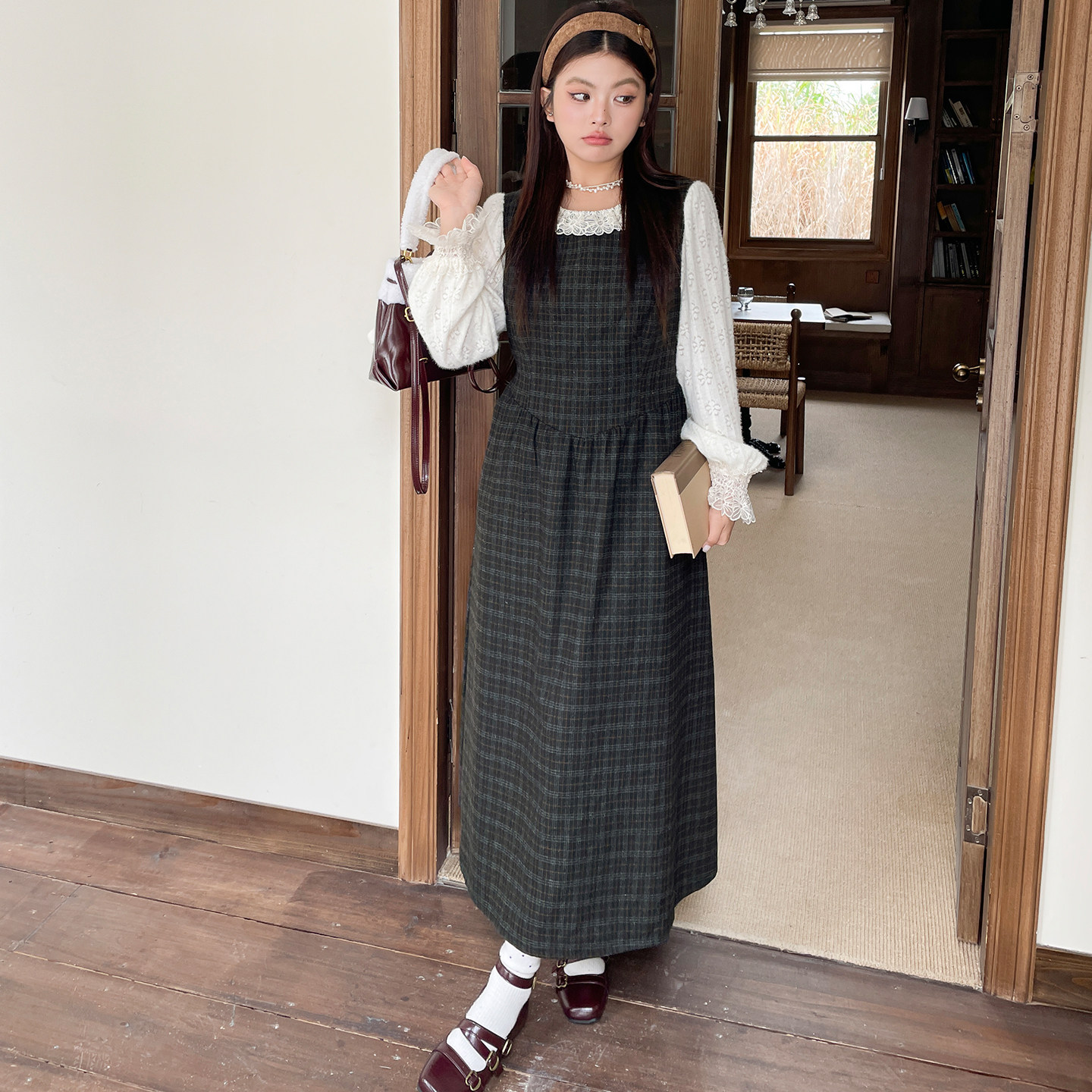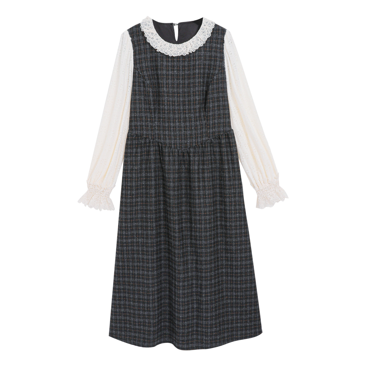 连衣裙法式 大码 蕾丝拼接冬装 胖mm超好看 格纹复古显瘦长裙子 女装