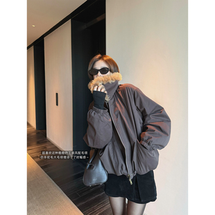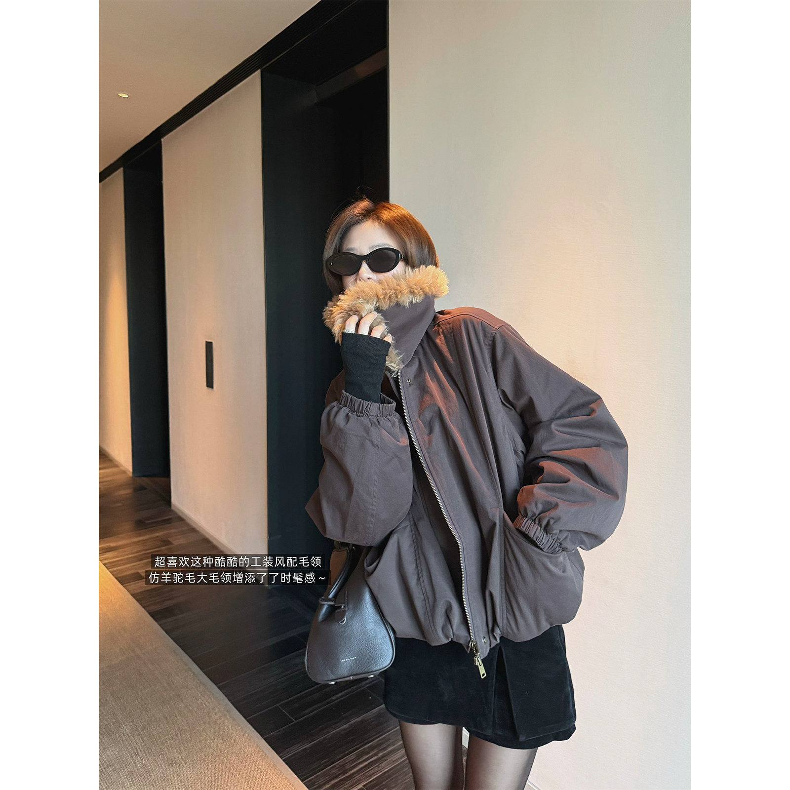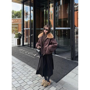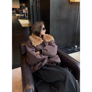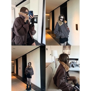 superniniyy 外套女 乌木棕仿羊驼毛毛大翻领时髦派克棉服拉链工装
