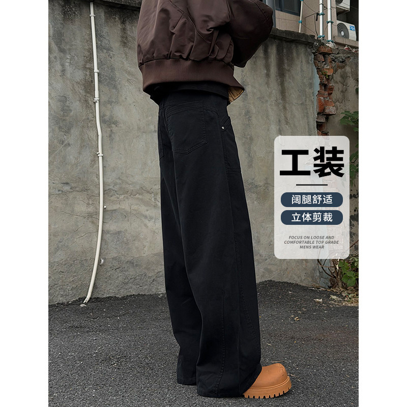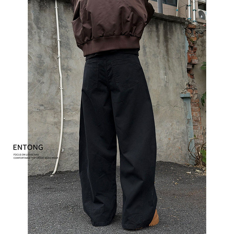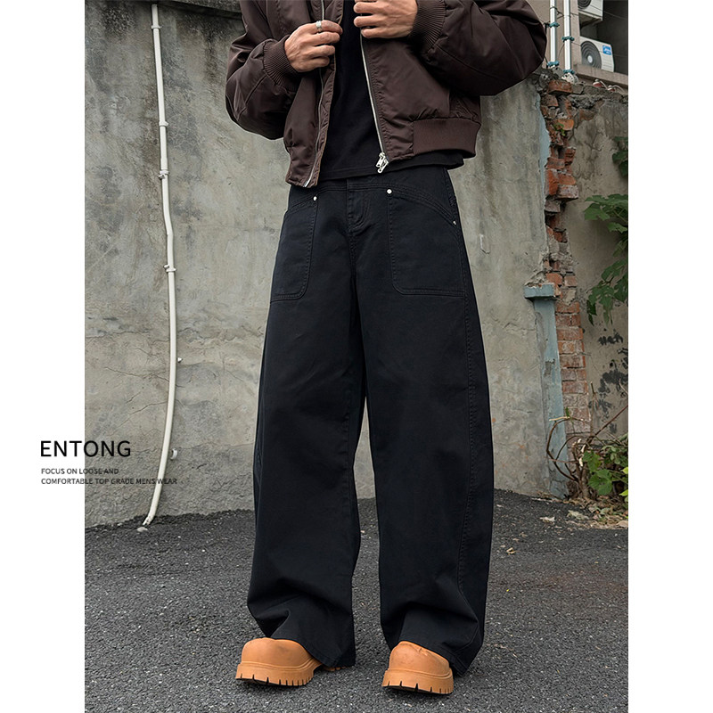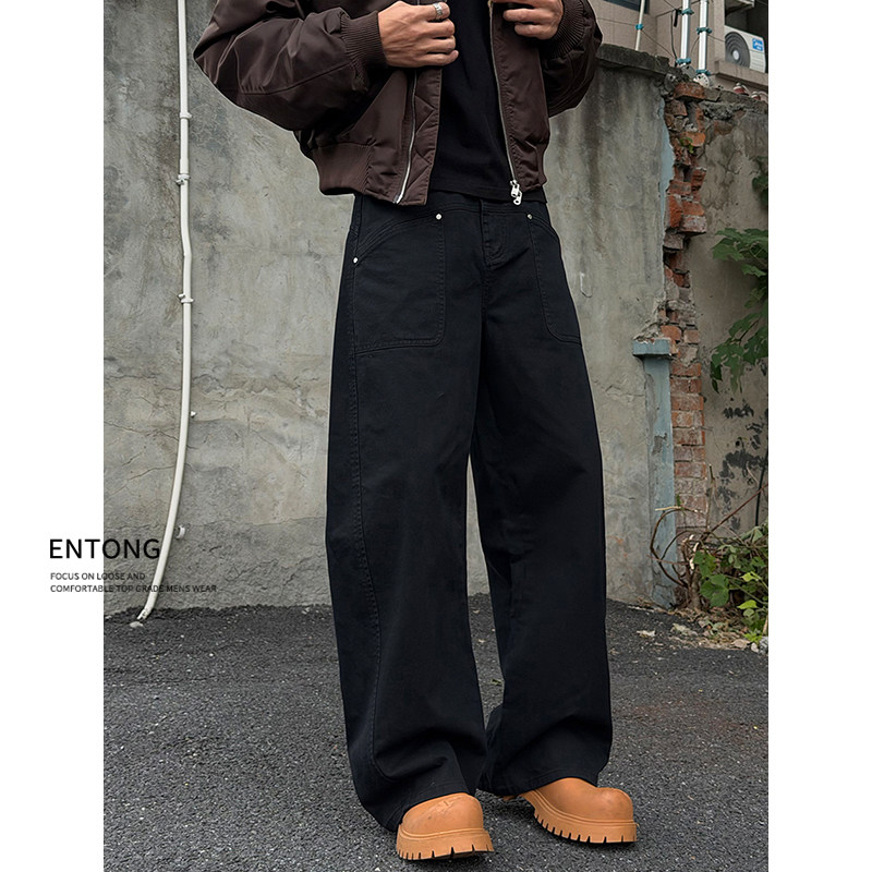 cleanfit黑色弯刀牛仔裤 裤 男款 拼接工装 子 宽松阔腿大码 Entong美式