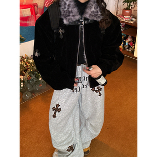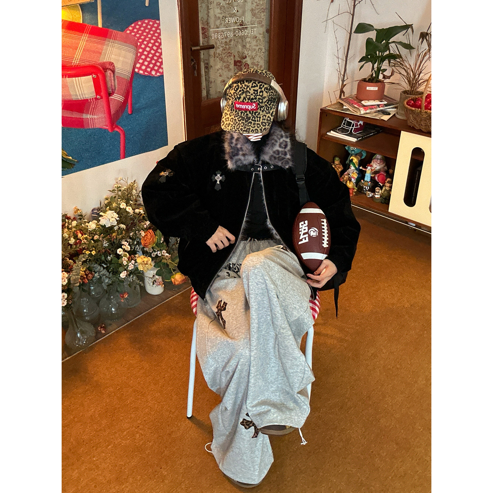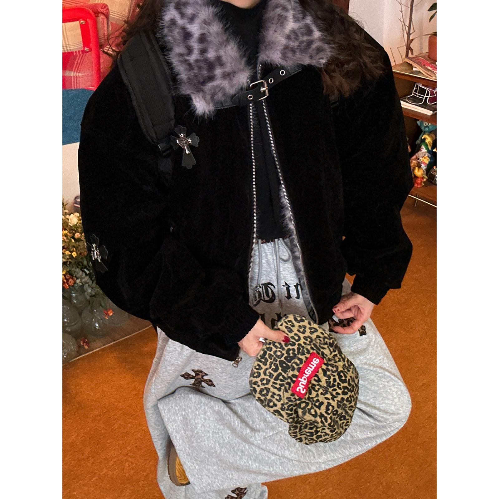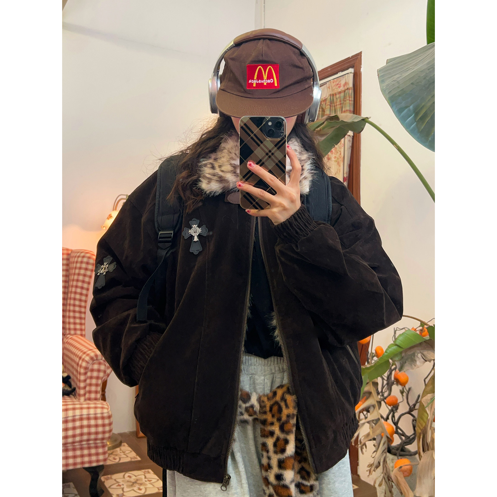 加绒加厚短款 复古麂皮绒豹纹毛领棉服女冬季 保暖外套 美式 C2自制