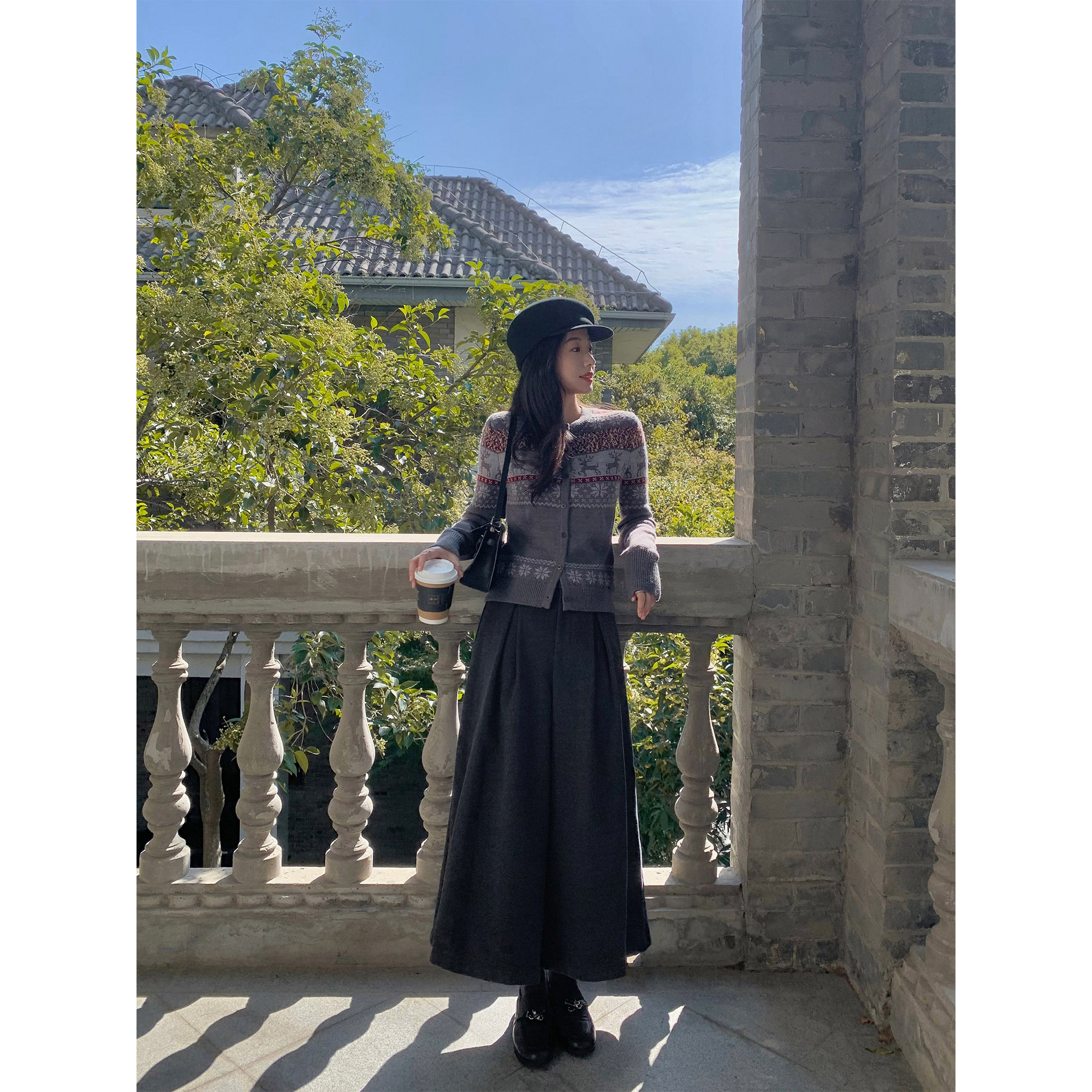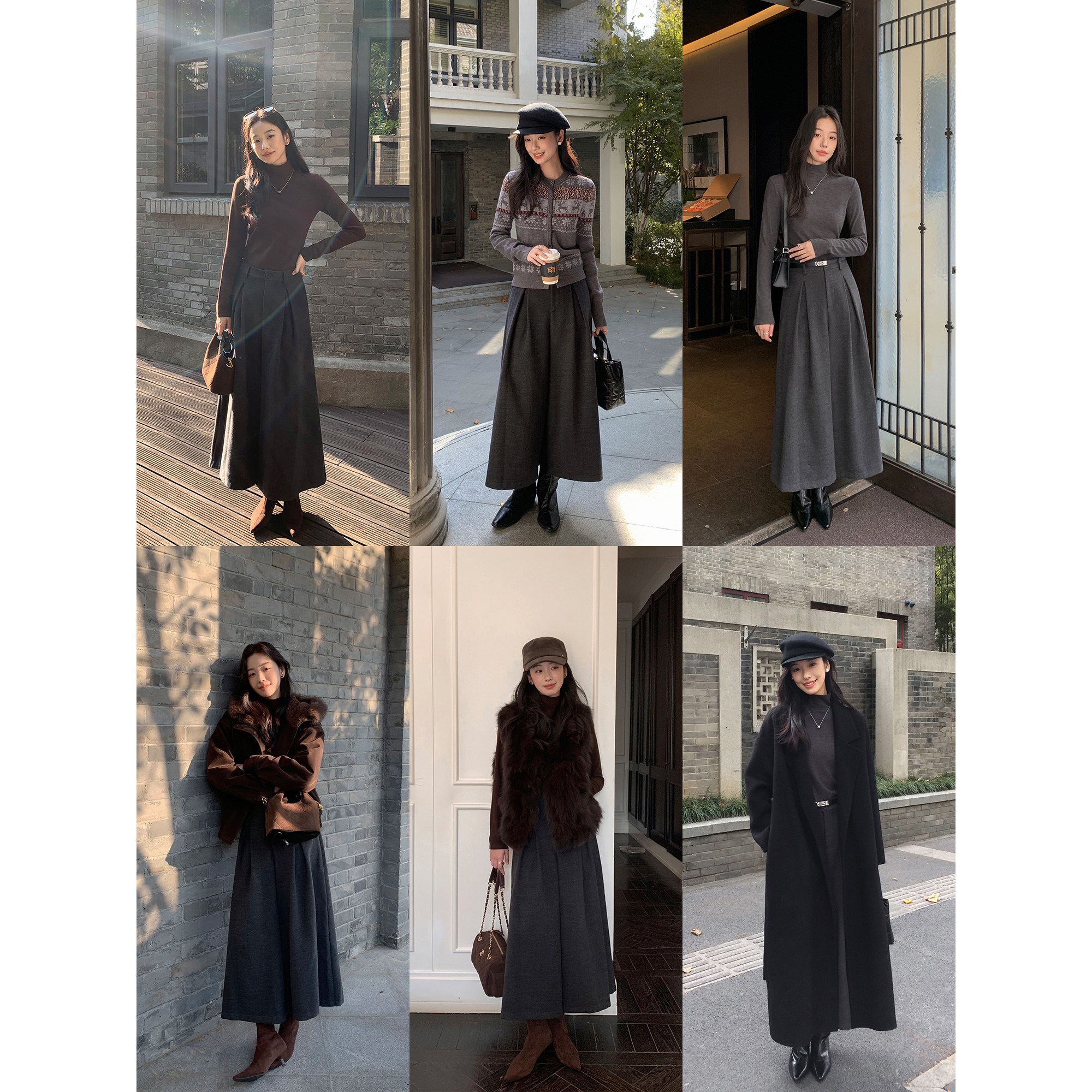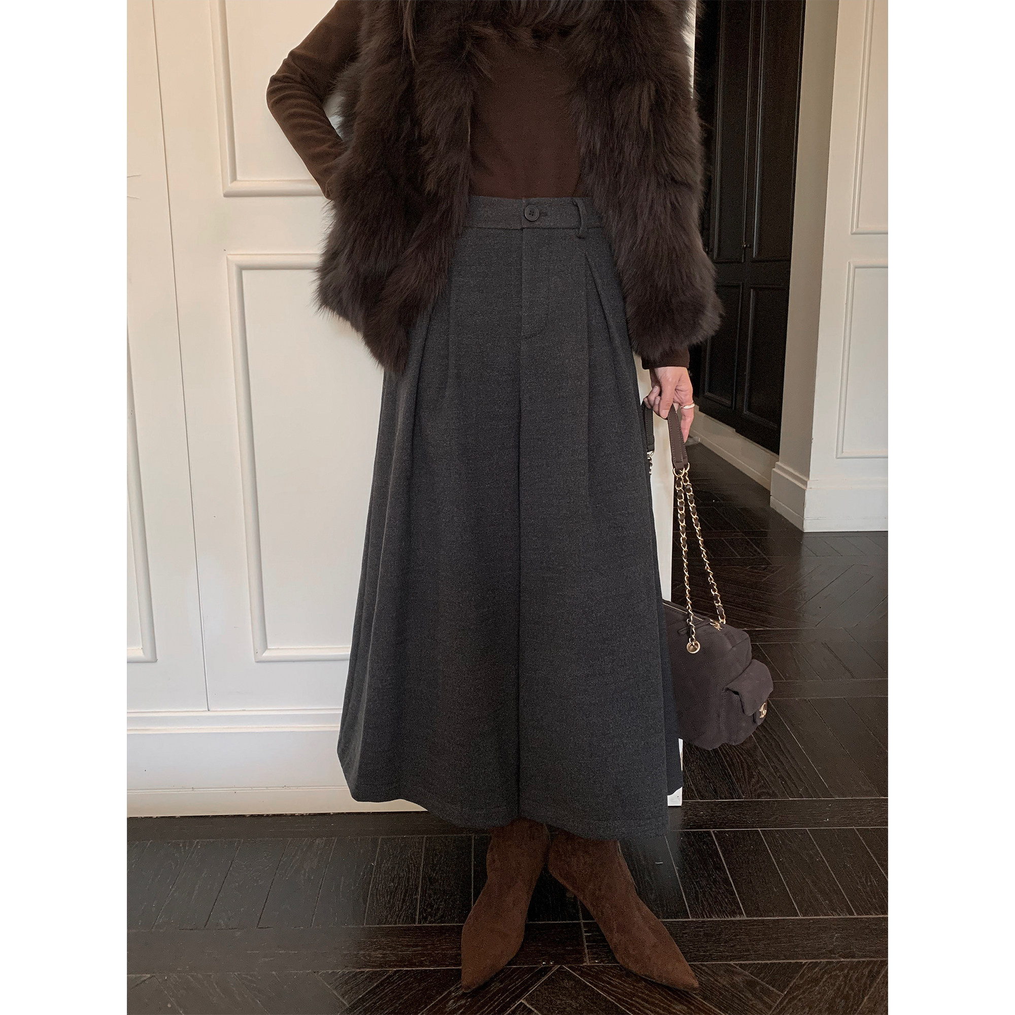 女高腰宽松休闲压褶裙裤 复古深灰色毛呢阔腿裤 周末看展 MULVAN