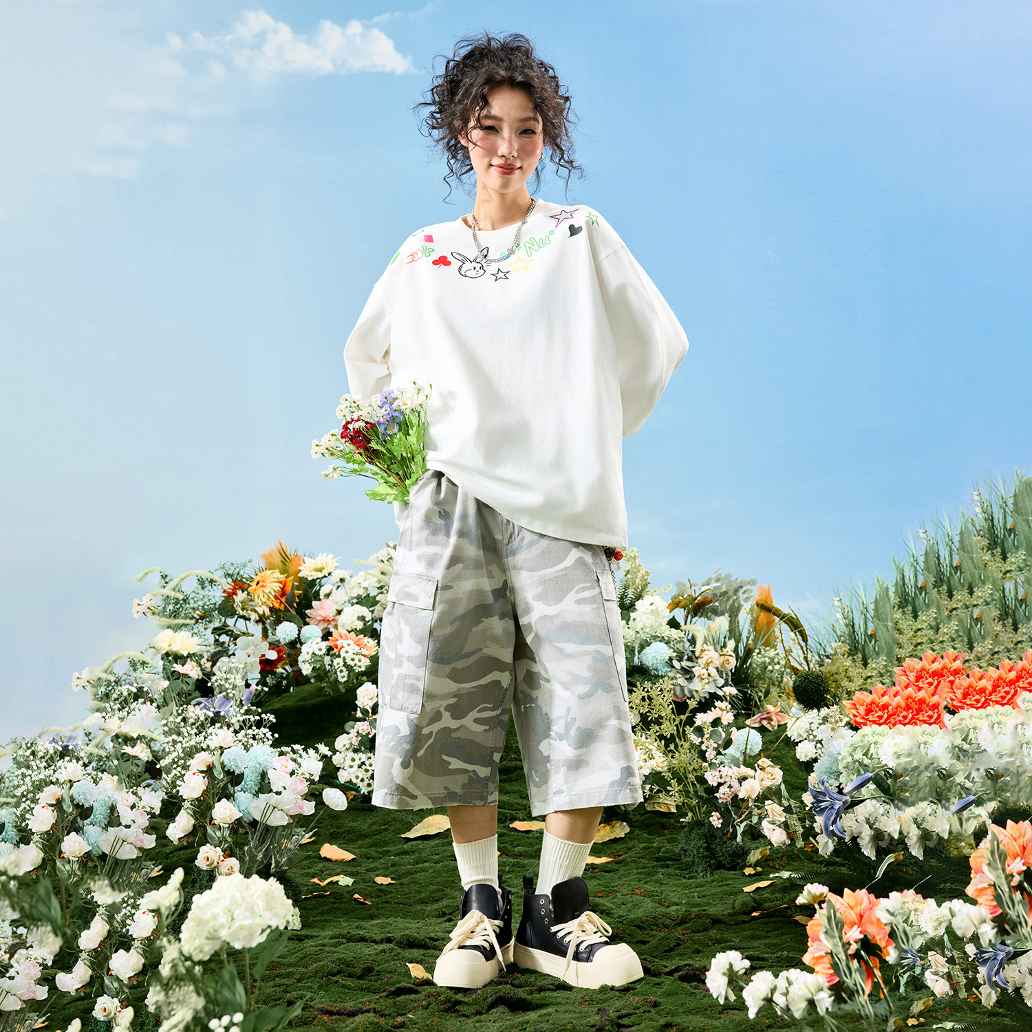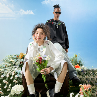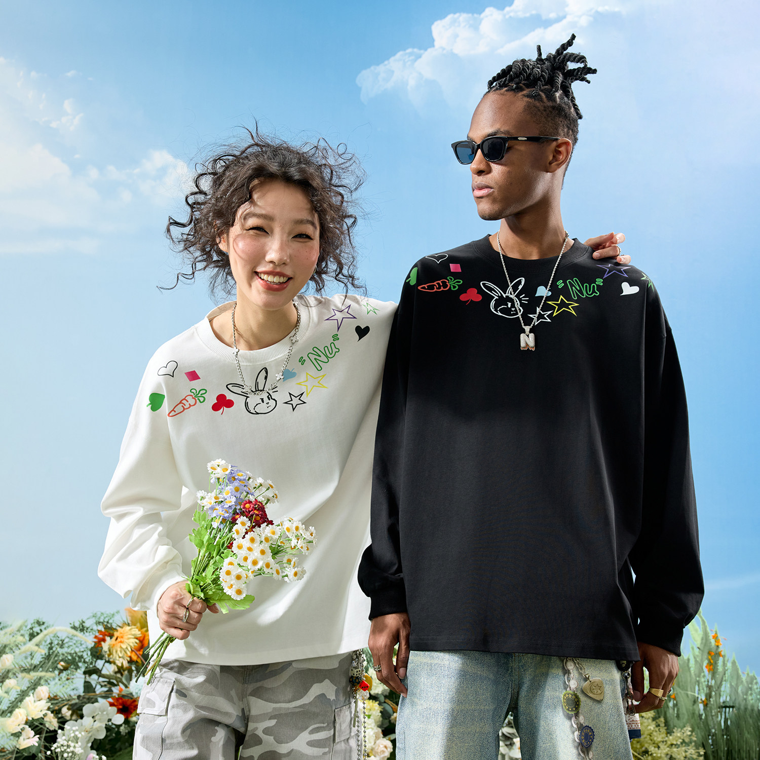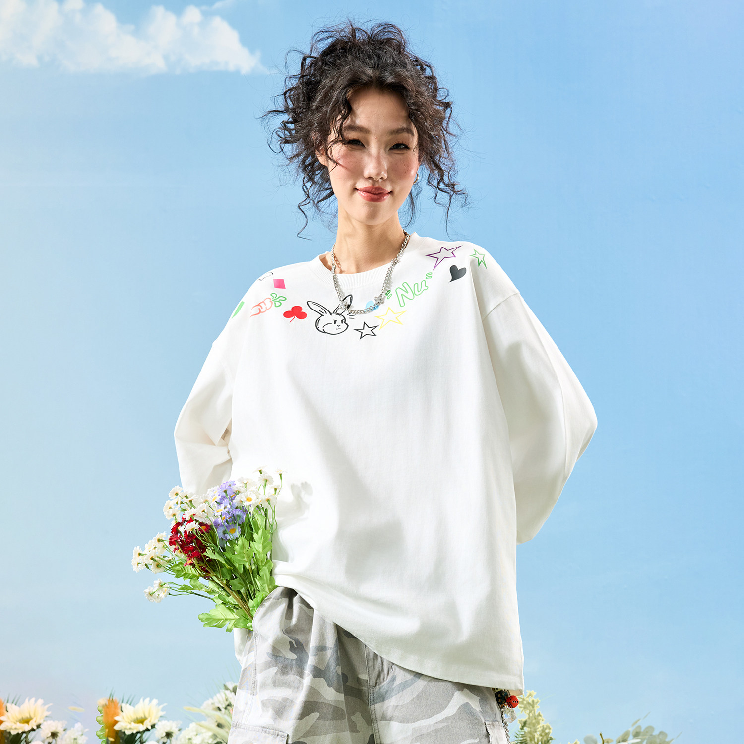 T恤情侣男女2025秋新款 Nuthink美式 潮牌童趣卡通涂鸦字母印花长袖