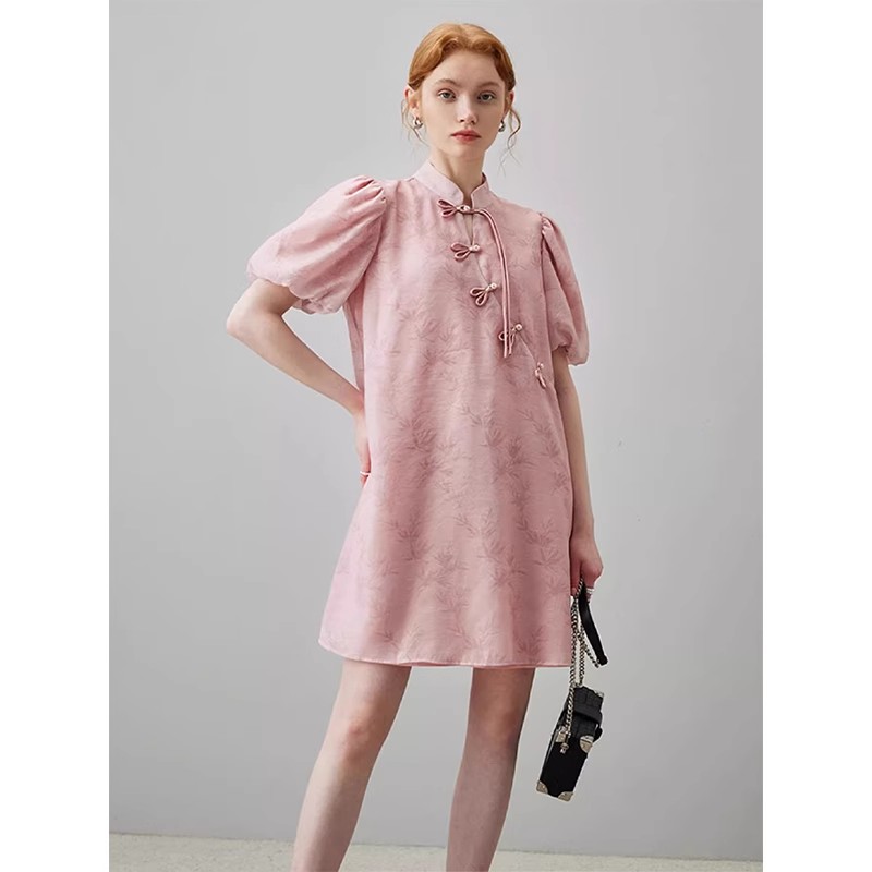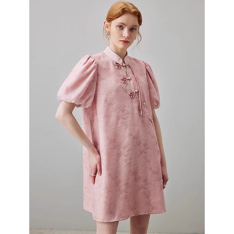 大码 2025春季 国风泡泡袖 新中式 连衣裙女提花盘扣宽松裙子 新款