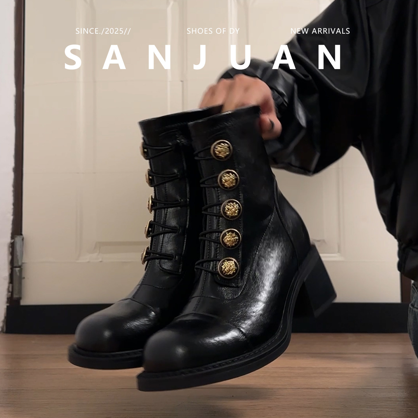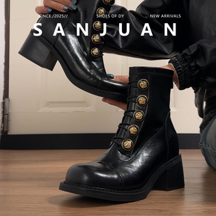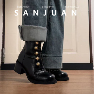 羊皮版 sanjuan三卷厚底马丁靴冬加绒高跟短靴小个子中筒靴英伦风