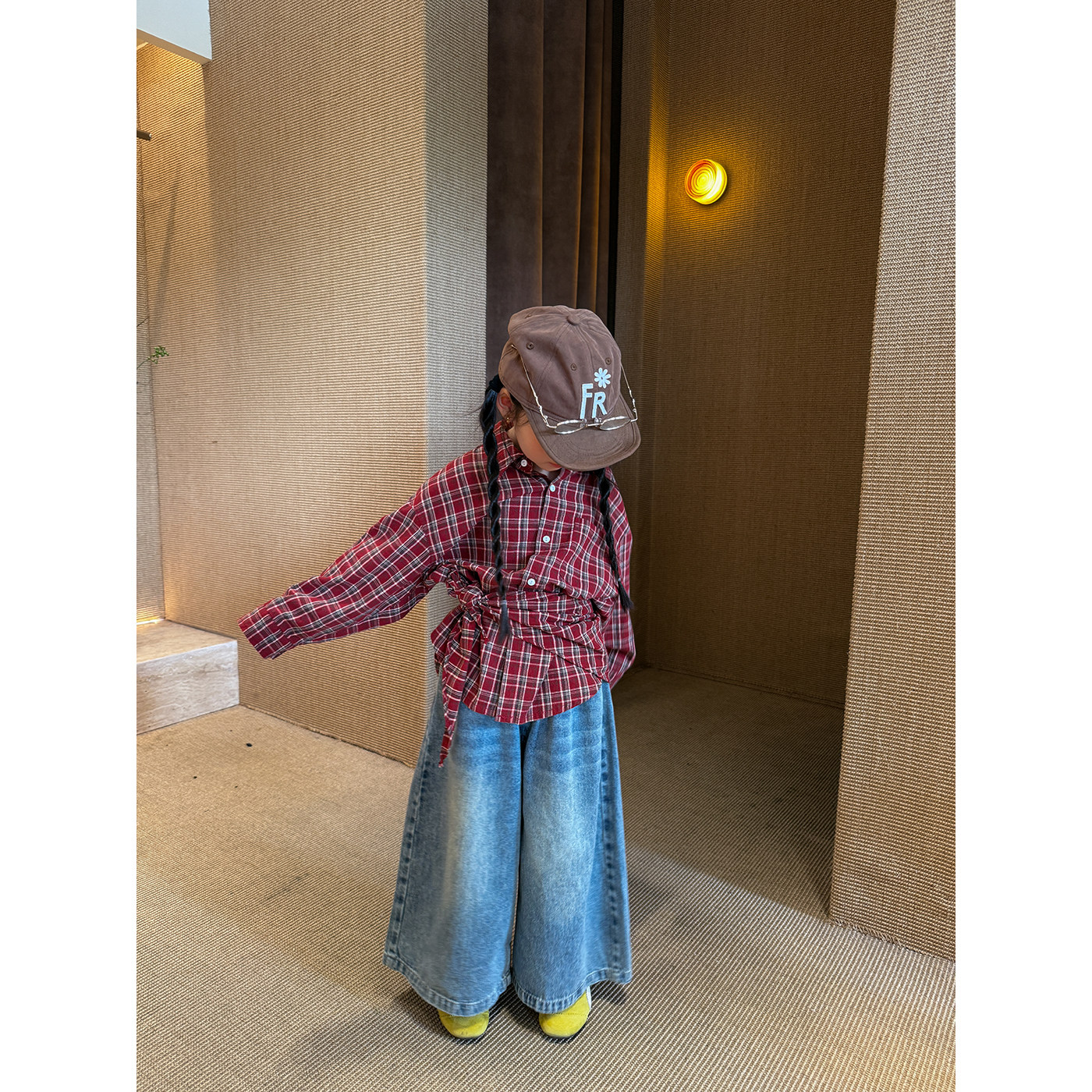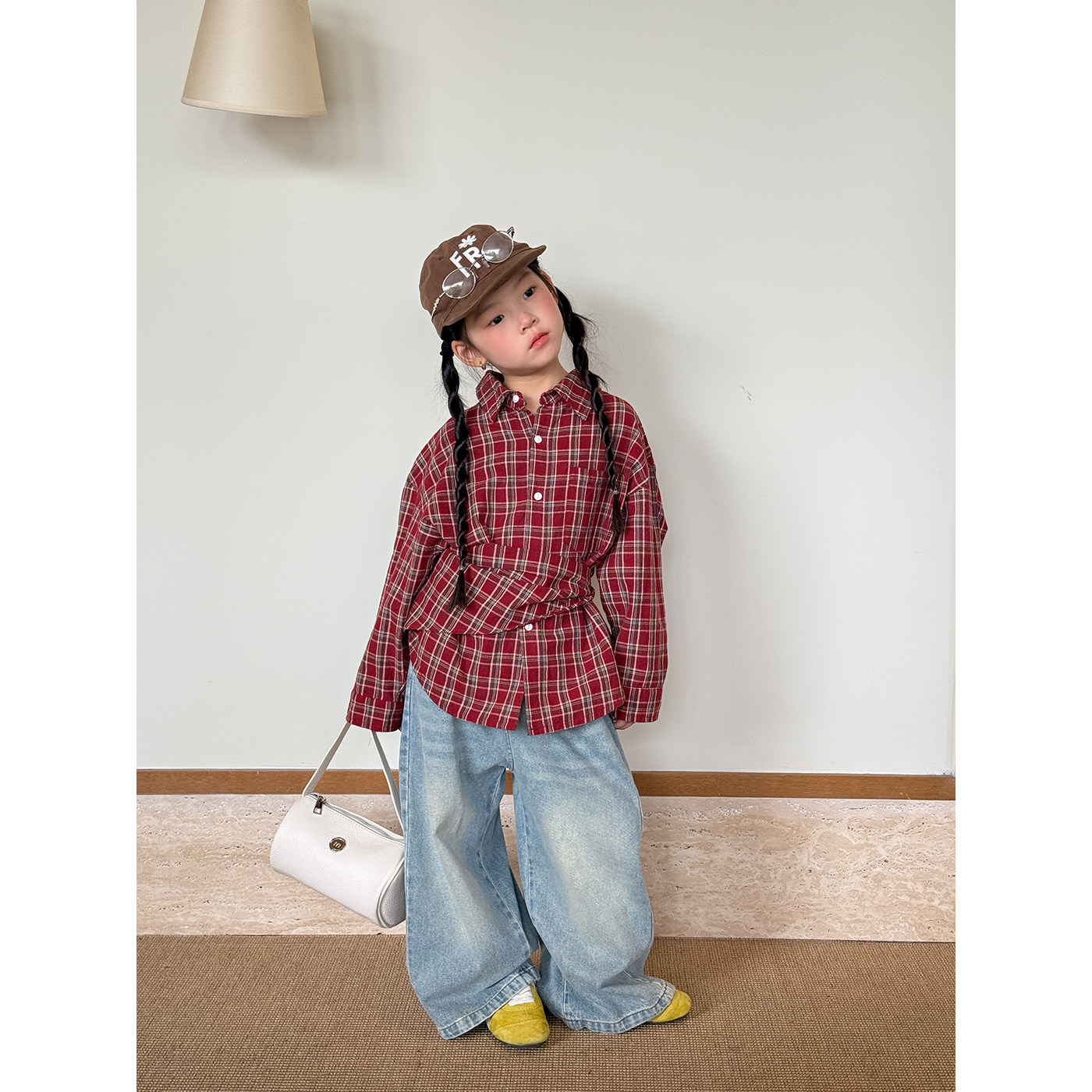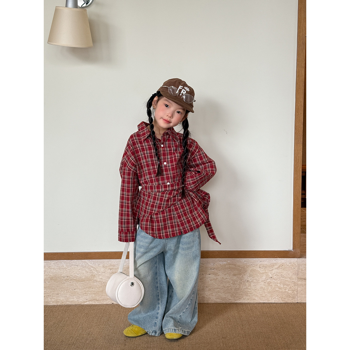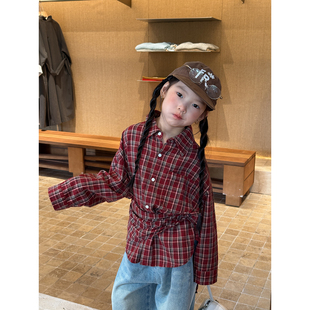 复古百搭翻领长袖 2025秋季 格子衬衫 女童韩版 衬衣配格子丝巾 新款