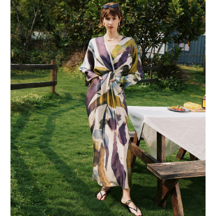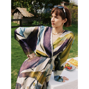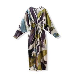 立裁V领蝙蝠袖 桑蚕丝珍珠缎 收腰真丝印花连衣裙 艺术氛围拉满