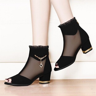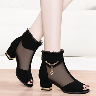 金属扣网纱中老年妈妈凉靴 外穿时尚 跨境粗跟鱼嘴包跟罗马女鞋 韩版