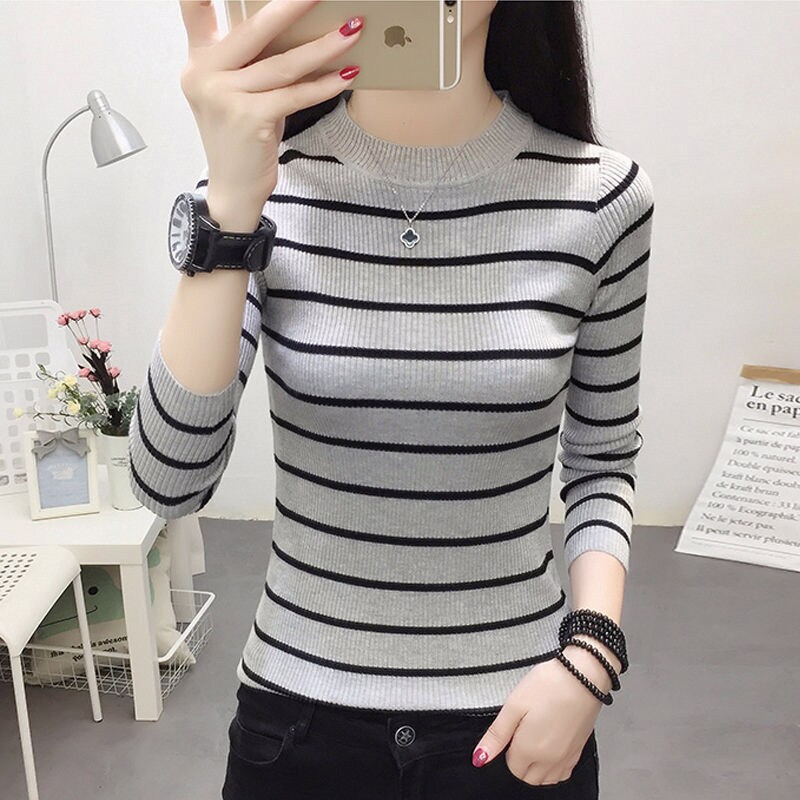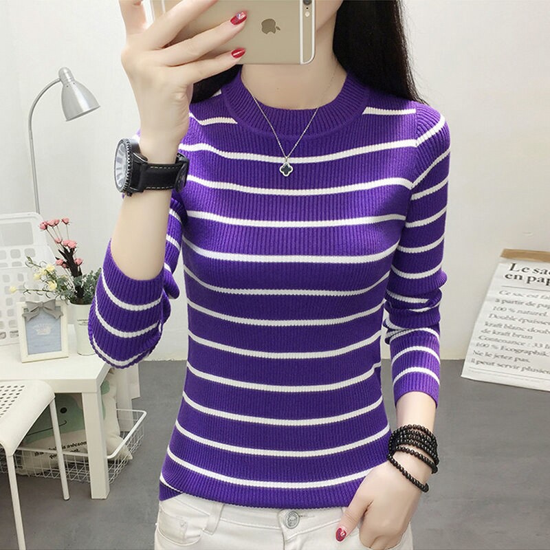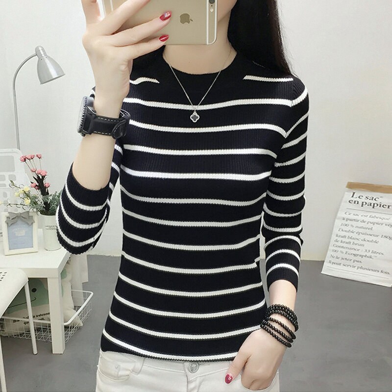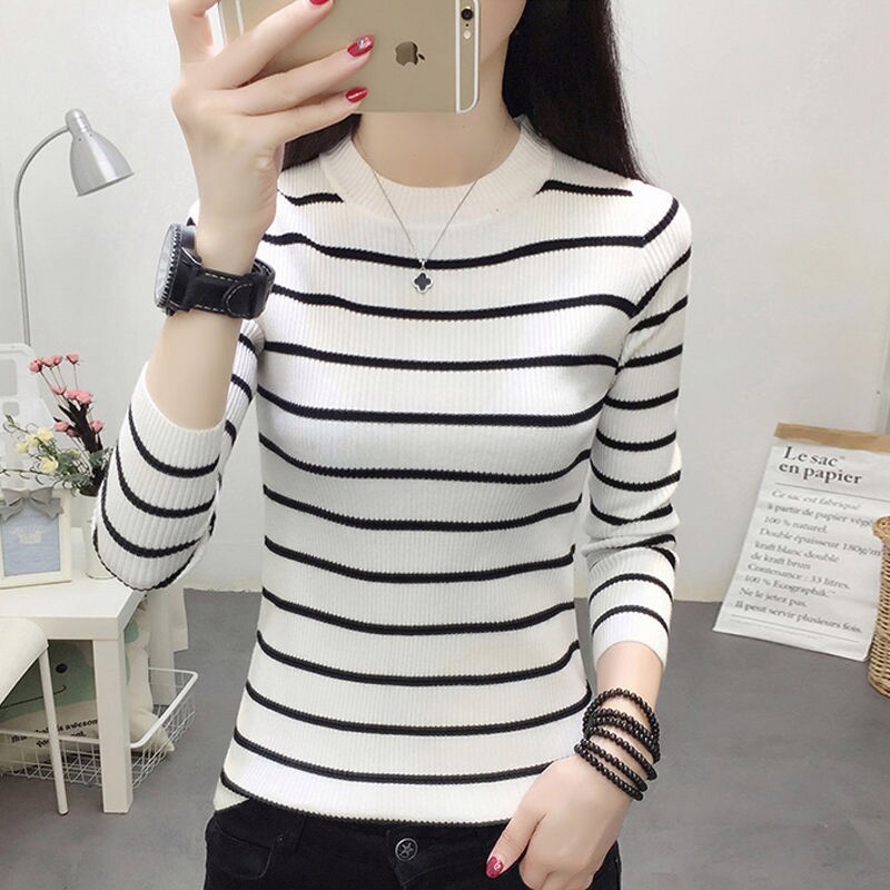 2020秋季 新款 韩版 修身 毛衣女装 打底衫 条纹圆领套头针织衫 潮 女长袖