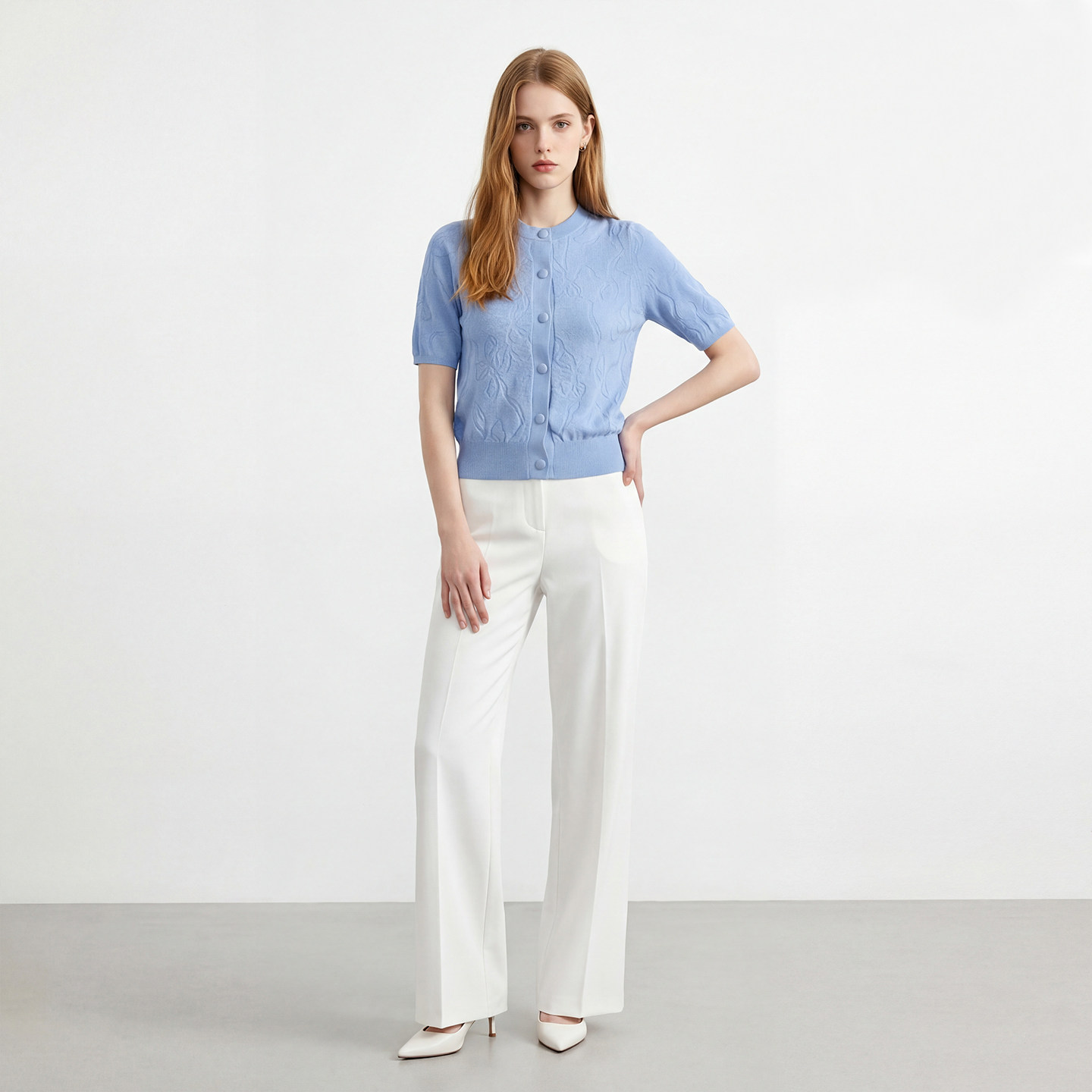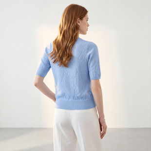 气质时尚 马天奴2026春夏新款 小衫 单排扣提花针织开衫 蓝色圆领短袖