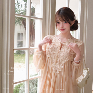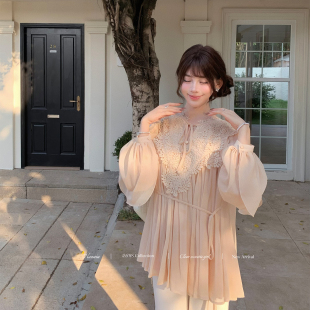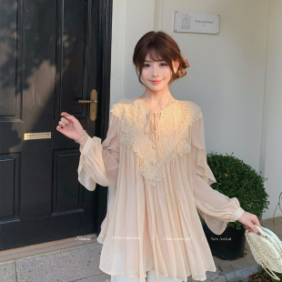 新款 甜水仙 春季 复古优雅立体钩花蕾丝拼接雪纺衫 宽松上衣 早樱子
