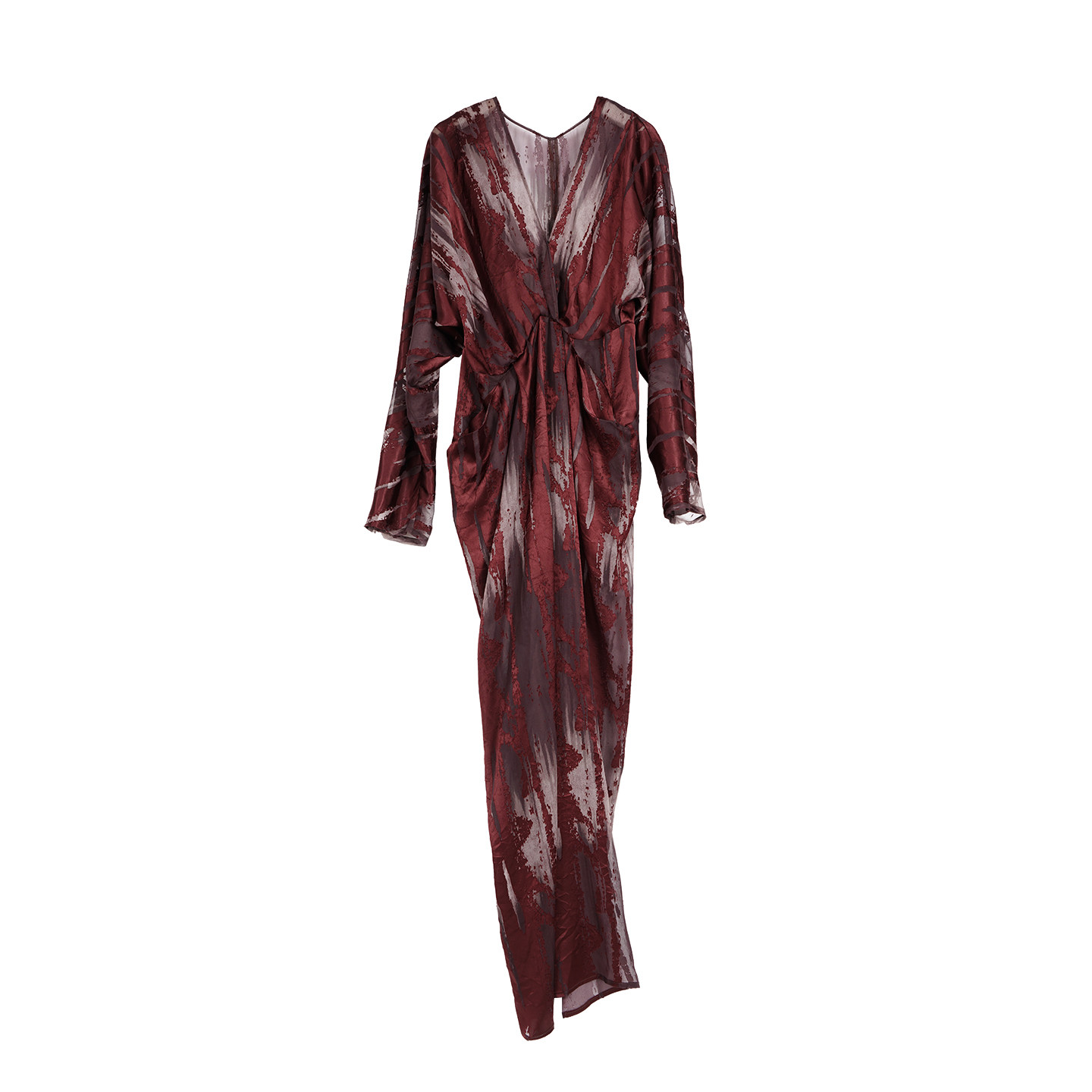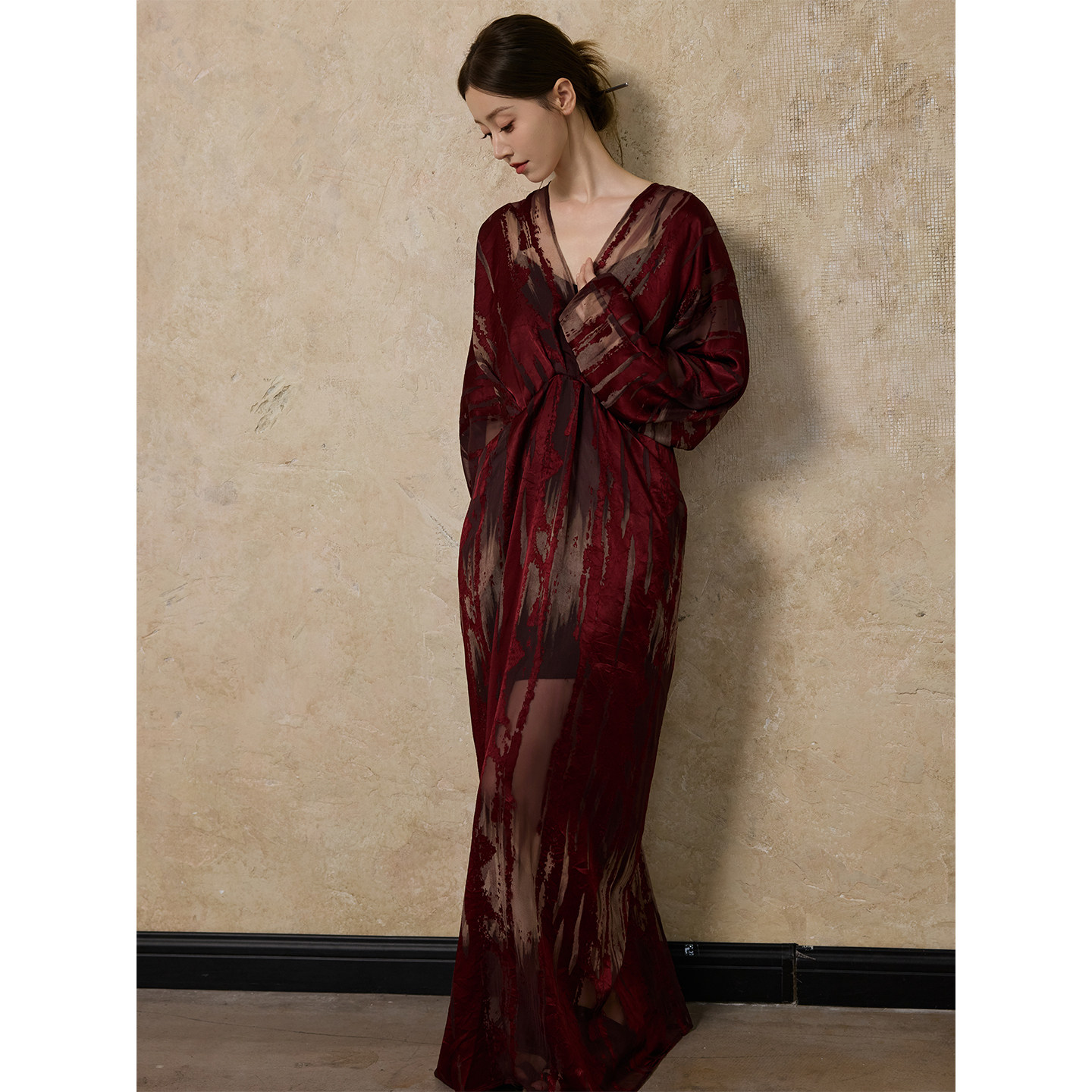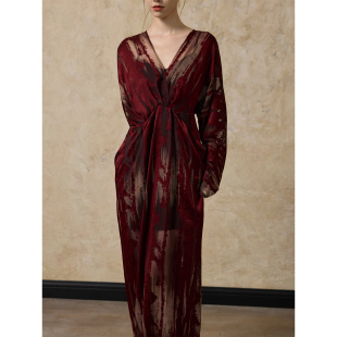 春季 V领优雅气质长袖 红色烧花蝙蝠袖 2026新款 礼服 连衣裙 ONMOON