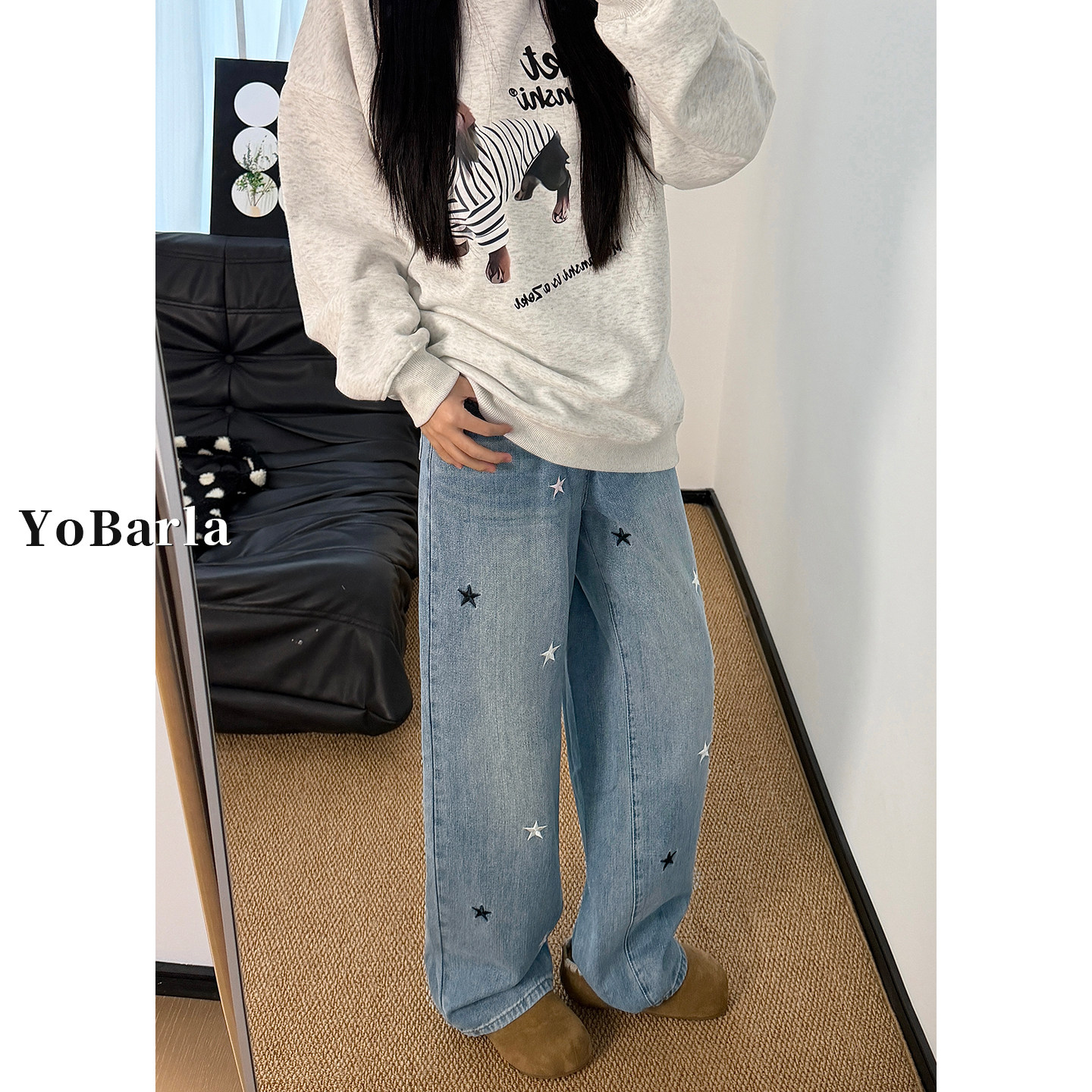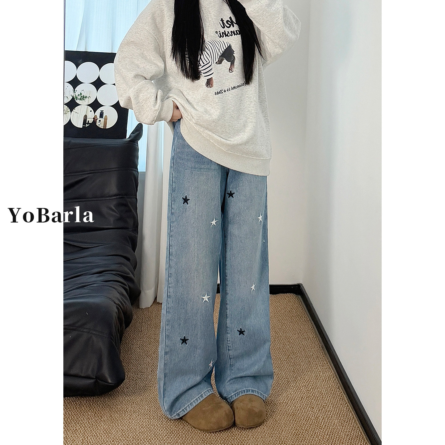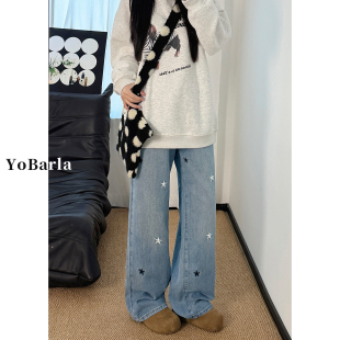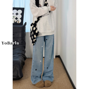 胖mm宽松显瘦阔腿裤 浅色星星刺绣直筒牛仔裤 大码 新款 子 女高腰春季